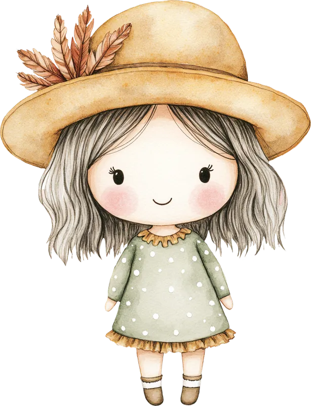 Cute Watercolor Girl Doll DTF Transfer - Boho Feather Hat Dress
