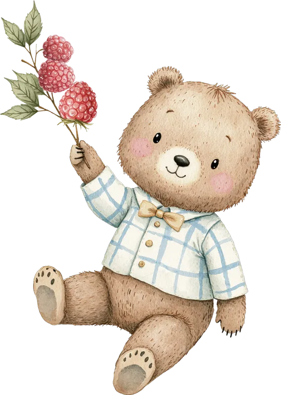 Cute Watercolor Teddy Bear with Raspberries DTF Transfer