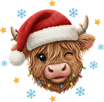 The design showcases an irresistibly cute Highland cow, winking playfully, adorned with a cozy red Santa hat and festive Christmas string lights wrapped around its fluffy face. Surrounded by delicate blue snowflakes and golden stars, this charming design captures the pure joy and whimsical spirit of the holiday season. It's a perfect holiday accent for anyone looking to add a touch of rustic cuteness to their apparel, delivered as a vibrant, ready to press DTF transfer. This delightful heat transfer design is perfect for animal lovers, farm enthusiasts, and anyone who adores Highland cows, especially during Christmas. It makes an ideal iron on transfer for crafting unique holiday gifts, creating matching family Christmas shirts, or for small businesses looking to add popular festive designs to their inventory. Imagine this adorable cow on apparel for Christmas parties, family gatherings, or even as a cheerful present for teachers and friends. Applying this high-quality heat press transfer is a breeze, working beautifully on a wide range of materials including cotton, polyester, cotton-poly blends, and even nylon. Achieve professional results using a heat press (recommended at 300-325°F for 15 seconds with medium pressure) or a household iron. Forget tedious weeding; simply peel and press! It's perfect for custom t-shirts, cozy hoodies, sweatshirts, festive tote bags, pillow covers, and even baby onesies, making it a versatile choice for all your holiday crafting. For best longevity, wash garments inside out and tumble dry on low. Experience superior quality with this ready to press transfer, featuring vibrant, full-color printing and exceptional fine detail that truly brings this adorable Highland cow to life. Our DTF transfers are designed to be crack-resistant and offer a soft hand feel, unlike stiff vinyl. Each direct to film transfer is printed on premium film with a strong adhesive backing, ensuring a durable and professional application that stands up to wear and washing, ready for immediate use.