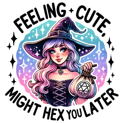 See allThis vibrant DTF transfer features an adorable, pastel-haired witch with a sassy attitude, framed by sparkling stars. The playful text 'Feeling Cute. Might Hex You Later' perfectly captures a mischievous, charming vibe. With its kawaii aesthetic and magical elements, this design is ready to press and adds a unique touch of whimsical rebellion to any garment. This bewitching design is perfect for anyone who loves witches, magic, and a good dose of sarcastic humor. Ideal for Halloween enthusiasts, pastel goth fans, anime lovers, and those looking for a unique iron on transfer for everyday wear. It makes a fantastic gift for friends or for adding a custom touch to your fall and spooky season apparel. Crafters and small businesses will find this a popular heat transfer design for their inventory. Applying this heat press transfer is a breeze! It works beautifully on cotton, polyester, cotton-poly blends, and even nylon. Simply use a heat press at 300-325°F for 15 seconds with medium pressure, or apply with a household iron. There’s no weeding involved – just peel and press for instant results. Customize t-shirt transfers, hoodies, tote bags, pillow covers, and denim jackets. For lasting durability, wash garments inside out and tumble dry on low. Experience professional-grade results with this high-quality direct to film transfer. It boasts vibrant, full-color printing with incredibly fine detail that truly pops. The design is crack-resistant, soft to the touch, and avoids the heavy, bulky feel of traditional vinyl. Each transfer is printed on premium DTF film with a strong adhesive backing, ensuring your creations look fantastic and last wash after wash.