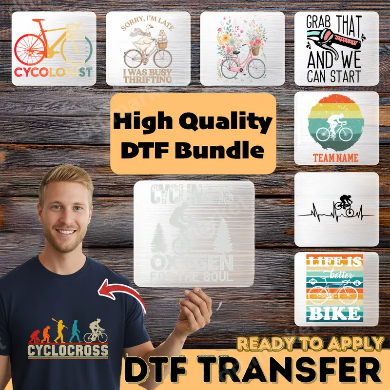 See allDiscover our exclusive Cycling Theme DTF Transfer Bundle, a vibrant collection designed for every bike enthusiast. This ready to press bundle features a diverse range of cycling designs, from humorous "Sorry, I'm Late, I Was Busy Thrifting" and "Cyclocross evolution" graphics to inspirational "Life Is Better on a Bike" and "Cycling Is Oxygen For The Soul" motifs. Each high-quality DTF transfer captures the spirit of the open road, mountain trails, and the joy of pedaling, making it perfect for personalizing your gear with unique style. This versatile collection is ideal for cyclists, mountain bikers, cyclocross racers, and anyone who loves the freedom of two wheels. Perfect for adding personality to team apparel, creating custom gifts for cycling club members, or preparing unique merchandise for bike-themed events and races. These heat press designs make thoughtful presents for birthdays, Father's Day, Mother's Day, or just to celebrate a fellow 'cyclogist' in your life, appealing to both casual riders and serious athletes. Our direct to film transfers are incredibly easy to apply, whether you use a professional heat press or a household iron. They adhere beautifully to a wide variety of fabrics, including cotton, polyester, and poly-blends, ensuring your custom creations look fantastic. Simply press at 300-325°F for 15 seconds with medium pressure, then peel. There's no tedious weeding or layering involved, making your customization projects quick and hassle-free, unlike traditional vinyl transfer applications. Experience superior quality with our premium DTF transfers. Each image boasts vibrant colors, sharp details, and excellent durability that stands up to countless washes without cracking, peeling, or fading. Made from professional-grade DTF film with strong, reliable adhesive, these shirt designs offer a soft hand feel and a professional finish every time. Elevate your apparel game with a high-quality heat transfer that truly lasts.