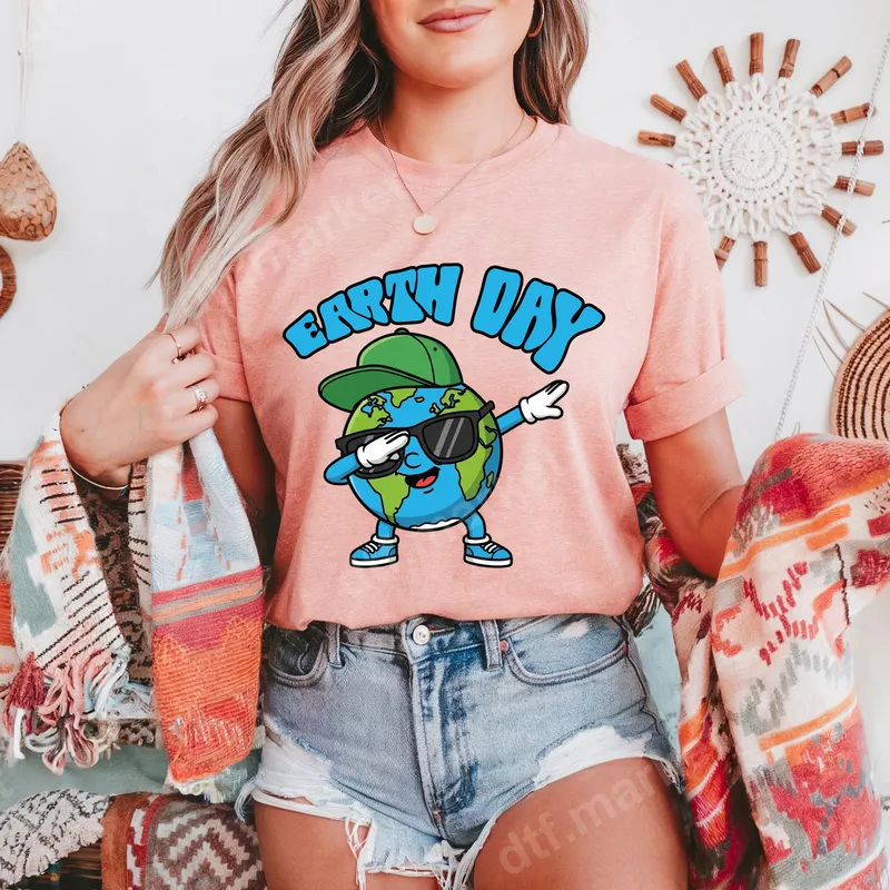 See allShow your planet pride with this hilarious Dabbing Earth Day DTF transfer! This vibrant design features our Earth globe wearing cool sunglasses, a green baseball cap, and sneakers, striking the iconic dab pose. The "EARTH DAY" text in a bold, blue outline crowns this fun image, making it a perfect ready to press statement for eco-conscious individuals. The cartoonish style brings a lighthearted, celebratory vibe to environmental awareness. This unique heat press design is ideal for anyone celebrating Earth Day in a fun, trendy way. Perfect for students, teachers, or families participating in clean-up events and eco-friendly gatherings. It makes an excellent gift for friends, kids, or colleagues who appreciate witty designs and care about the planet. Spread positive vibes with this dabbing Earth design that's sure to get smiles. Our premium DTF transfers are incredibly versatile, working beautifully on a wide range of fabrics including cotton, polyester, and various blends. Application is simple: use a heat press at 300-325°F for 15 seconds with medium pressure, then cold peel the film. For those without a professional press, a household iron can be used. These direct to film transfers require no weeding, saving you time and effort. Experience the superior quality of our professional-grade DTF transfers. Each heat transfer design is printed with vibrant, long-lasting colors that resist cracking and fading, ensuring your apparel looks great wash after wash. The finished graphic is soft to the touch and offers excellent stretch. Our durable DTF film and strong adhesive ensure a perfect, long-lasting bond, making it a reliable iron on decal for any project.
