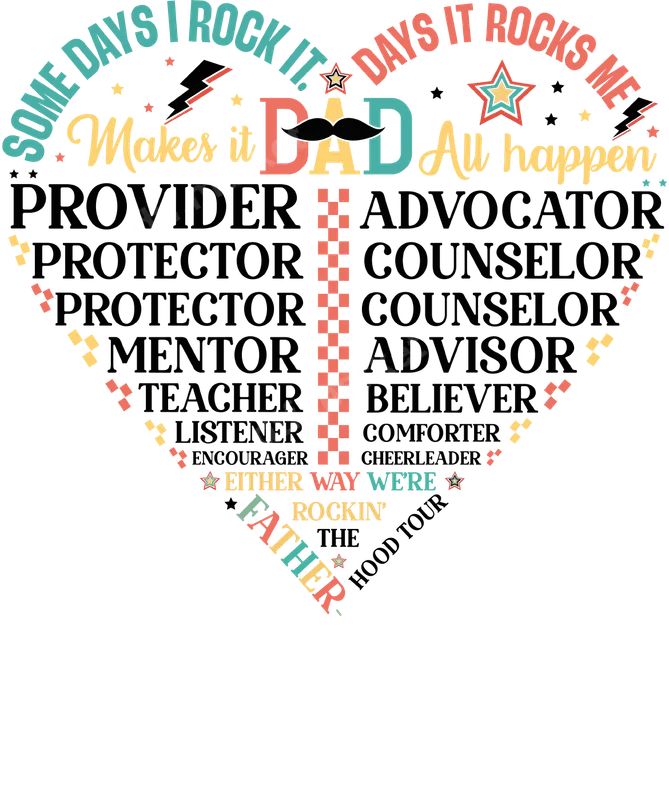 See allCelebrate the multifaceted role of every incredible father with this vibrant 'Dad Life Heart Qualities' DTF transfer. This unique heat transfer design, shaped like a heart, creatively lists key dad roles such as Provider, Protector, Mentor, Advisor, and Cheerleader, framed by the playful phrases "Some days I rock it. Days it rocks me. Makes it DAD all happen" and "Either way we're rockin' the Fatherhood Tour." Boasting a cool retro aesthetic with a mix of colorful typography and small graphic accents like stars and lightning bolts, this design is a perfect ready to press statement piece. This iron on transfer is ideal for the dads, grandpas, stepdads, and father figures who juggle it all. It makes a thoughtful and personal gift for Father's Day, birthdays, Christmas, or simply to show appreciation any day of the year. Create custom apparel that acknowledges their hard work and love, perfect for casual wear, family gatherings, or as a proud declaration of fatherhood. Our premium DTF transfers are incredibly versatile and can be applied to a wide range of fabrics, including 100% cotton, 100% polyester, and various blends. For best results, use a heat press at 300-325°F for 15 seconds with medium pressure, then warm peel. For those without a heat press, a household iron can also be used following careful instructions. Enjoy the convenience of a ready to press design with no weeding required, making custom apparel creation simple and fast. Experience professional-grade quality with this apparel transfer. Each direct to film transfer is known for its exceptional vibrancy, crack-resistant flexibility, and a soft-to-touch finish that integrates beautifully with the garment. Crafted using durable DTF film and strong adhesive, this t-shirt transfer ensures a long-lasting, high-quality result that will stand up to countless washes, celebrating the enduring spirit of fatherhood.