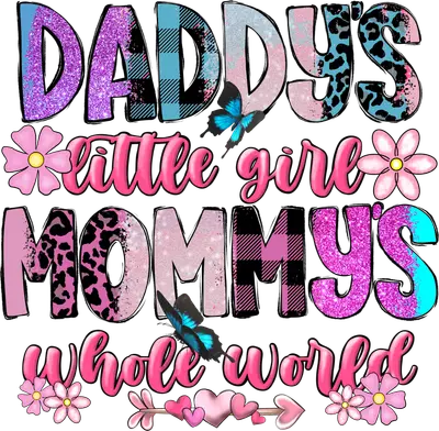 See allThis heartwarming DTF transfer features the touching phrase 'Daddy's little girl Mommy's whole world' in a vibrant, mixed-pattern typography style. Glitter, leopard print, and plaid textures in shades of pink, purple, and blue combine with delicate butterflies and charming flowers, creating a playful yet sentimental design. It's a perfect ready to press transfer to express the deep love and bond within a family. This sweet iron on transfer is perfect for new parents, grandmothers, and anyone celebrating their precious daughter. Ideal for baby showers, Mother's Day, Father's Day, birthdays, or just because. Small boutique owners and Etsy t-shirt sellers can use this heat transfer design to create best-selling apparel. It's also a thoughtful gift for expecting parents or a proud mom and dad showing off their little one. Applying this beautiful heat press transfer is simple and mess-free. It works seamlessly on a variety of materials including cotton, polyester, and blends, and even nylon. Just use a heat press at 300-325°F for 15 seconds with medium pressure, or a household iron. There’s no weeding needed—simply peel and press! Create custom t-shirts, adorable baby onesies, cozy hoodies, tote bags, pillow covers, and denim jackets. For long-lasting results, wash garments inside out and tumble dry on low heat. Experience superior quality with this ready to press transfer, featuring vibrant, full-color printing that captures every detail, from the sparkling glitter to the intricate patterns. Our transfers are crack-resistant, soft to the touch, and avoid the heavy, stiff feel of traditional vinyl. Each direct to film transfer is printed on premium DTF film with a robust adhesive backing, ensuring professional-grade results that stand up to countless washes.