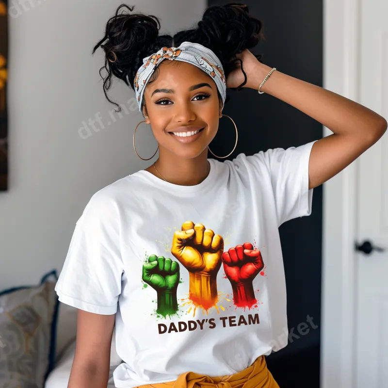See allThis vibrant DTF transfer proudly declares "DADDY'S TEAM" beneath a trio of powerful, raised fists in green, yellow, and red. Each fist features a cool, splattered paint effect, giving it a bold, energetic aesthetic. This heat press ready graphic embodies unity, strength, and unwavering support for the special 'Daddy' in your life, making it an ideal choice for custom apparel. This "Daddy's Team" design is perfect for children, spouses, or anyone celebrating a father figure. It makes an excellent gift for Father's Day, birthdays, family reunions, or just to show everyday appreciation. Ideal for creating custom t-shirts for family outings, sporting events, or casual wear, this design allows everyone to proudly represent their patriarch. Applying this ready to press transfer is incredibly simple. Our premium DTF transfer works flawlessly on cotton, polyester, and blends. For best results, use a heat press at 300-325°F for 15 seconds with medium pressure, followed by a cold peel. It can also be applied with a household iron, making it an excellent iron on transfer. There's no weeding required, so your project is ready to press right out of the package. Experience superior quality with this professional-grade direct to film transfer. Each heat transfer ensures exceptionally vibrant colors that pop, along with excellent durability. Our designs are engineered to be crack-resistant, fade-resistant, and incredibly soft to the touch, lasting wash after wash. Crafted on high-quality DTF film with a strong, reliable adhesive, your custom transfer will adhere perfectly and maintain its stunning appearance.