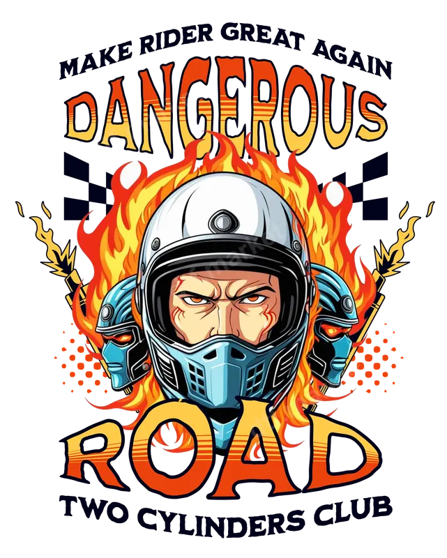 See allEmbrace the thrill of the open road with this intense 'Dangerous Road: Two Cylinders Club' DTF transfer. Featuring a fierce biker in a classic helmet, engulfed in vibrant flames and flanked by futuristic smaller helmets, this design embodies speed and rebellion. The bold text 'MAKE RIDER GREAT AGAIN' and 'DANGEROUS ROAD' with a racing checkered flag motif makes this a standout ready to press apparel transfer for any enthusiast. This dynamic heat press design is perfect for motorcycle club members, riders, racing fans, and anyone who lives for the roar of a two-cylinder engine. It makes an excellent gift for birthdays, Father's Day, or simply to celebrate the passion for biking. Customize your gear for rallies, meetups, or everyday wear with this eye-catching graphic. Applying this high-quality heat transfer is straightforward and hassle-free. Our direct to film transfers adhere beautifully to a wide range of fabrics including cotton, polyester, and their blends. For best results, use a heat press at 300-325°F for 15 seconds with medium, firm pressure. You can also achieve great results with a household iron. No weeding required, making customization quick and easy. Experience professional-grade results with our durable DTF transfers. Each iron on decal boasts vibrant colors that pop, superior crack-resistant flexibility, and a soft, lightweight feel on your garment. Crafted with premium DTF film and strong adhesive, this shirt design ensures a long-lasting, striking look that will withstand countless washes and adventures, keeping your biker spirit alive.