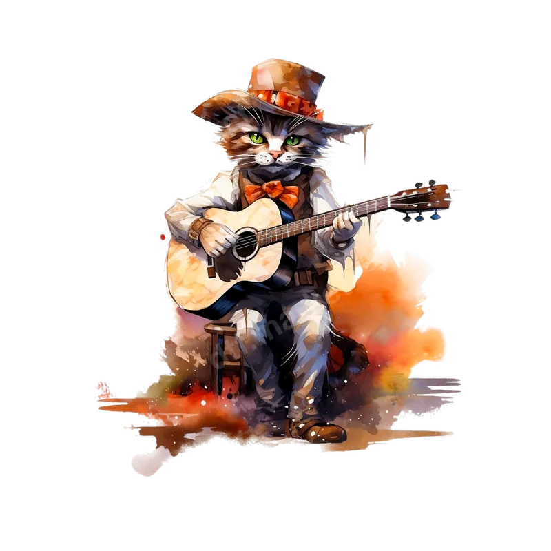 See allThis captivating direct to film transfer showcases a dapper cat, exquisitely rendered in a watercolor style, strumming an acoustic guitar. Dressed in a stylish fedora, vest, and an orange bow tie, this feline musician emanates a cool, folk-inspired vibe. The artistic splatters and warm, earthy tones surrounding the cat add depth and character, making it a truly unique piece. This DTF transfer is a ready to press design, perfect for bringing a touch of whimsical artistry to any fabric item. This charming heat press transfer is ideal for cat lovers, music enthusiasts, folk and country music fans, or anyone who appreciates quirky, artistic designs. It makes a fantastic personalized gift for birthdays, holidays, or simply to show off your unique style. Imagine it on a shirt for a music festival, a tote bag for a casual outing, or a hoodie for cozy evenings. It's a versatile apparel transfer that resonates with creatives and pet owners alike. Applying this design is incredibly simple. This heat press ready transfer adheres perfectly to a wide range of materials, including cotton, polyester, and various fabric blends. For best results, use a heat press at 300-325°F for 15 seconds with medium pressure. It can also be applied with a standard household iron, following included instructions. The best part? There's absolutely no weeding or intricate prep work required, saving you time and effort. Our premium DTF transfers are crafted for exceptional quality and durability. Expect vibrant colors that pop, a soft-to-the-touch feel that won't crack or peel, and professional-grade resolution. Each shirt design is printed on high-quality DTF film with a strong, flexible adhesive, ensuring a lasting bond with your garment. Enjoy professional results that stand up to countless washes, keeping your custom creation looking fresh.