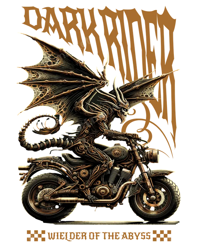 See allUnleash your inner rebel with this striking 'Dark Rider' DTF transfer. This intricate ready to press design features a formidable winged demon, clad in mechanical armor, riding a highly detailed, steampunk-inspired motorcycle. Bold "DARK RIDER" lettering above and "WIELDER OF THE ABYSS" below perfectly blend gothic fantasy with biker culture, creating a powerful statement piece. This powerful heat press transfer is ideal for motorcycle enthusiasts, gothic fashion followers, steampunk admirers, and fans of dark fantasy art. Perfect for adding an edgy touch to your wardrobe for biker rallies, rock concerts, Halloween, or expressing unique style. Gift this custom transfer to friends or family who appreciate bold, intricate designs with a touch of the macabre. Applying this high-quality iron on transfer is simple and efficient. It adheres flawlessly to cotton, polyester, and various blends. For best results, use a heat press at 300-325°F for 15 seconds with medium pressure, then cold peel. A household iron can also be used carefully. Enjoy a professional finish without weeding, making customization projects effortless. Experience vibrant colors and exceptional durability with every direct to film transfer from dtf.market. Our professional-grade DTF film ensures a soft feel, crack-resistant longevity, and excellent washability. This intricate apparel transfer won't fade or peel easily, maintaining sharp details and captivating presence. Elevate your apparel with a transfer that truly stands the test of time and style.
