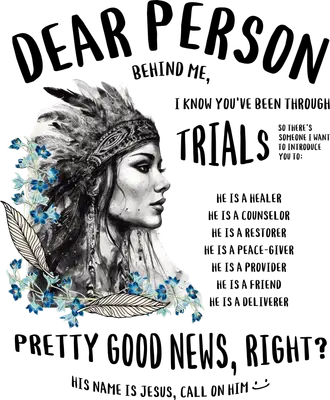 This heartwarming "Dear Person Behind Me Jesus" DTF transfer features a soulful woman in a feathered headdress framed by delicate blue flowers. The bohemian art style beautifully complements the powerful faith message: "I know you've been through trials... His name is Jesus, call on Him." This inspirational graphic conveys hope and comfort, making it a perfect statement piece. It arrives as a vibrant, full-color, ready to press transfer, prepared to transform your chosen garment. This unique design is perfect for individuals looking to express their Christian faith in a stylish and meaningful way, or for anyone seeking to spread encouragement. It makes an exceptional gift for friends, family, or church members who appreciate spiritual apparel and bohemian art. Small t-shirt businesses and crafters will find this iron on transfer ideal for creating custom faith-based clothing lines, gifts for youth groups, or items for spiritual retreats. Share this powerful heat transfer design with those needing a reminder of divine support. Applying this heat press transfer is quick and easy, adhering flawlessly to cotton, polyester, cotton-poly blends, and even nylon, offering versatility for your projects. Achieve professional results with a heat press (recommended at 300-325°F for 15 seconds with medium pressure), or a household iron. Forget weeding—simply peel and press! This design is perfect for customizing t-shirts, hoodies, sweatshirts, tote bags, and pillow covers. For best longevity, wash garments inside out and tumble dry low. Our ready to press transfer boasts vibrant, full-color printing with exceptional fine detail that truly brings the art to life. The durable print is crack-resistant and offers a soft, lightweight feel, avoiding the heavy, stiff texture often associated with vinyl. Each direct to film transfer is meticulously produced on premium DTF film with a strong adhesive backing, ensuring professional, long-lasting results for all your apparel and accessory creations.
