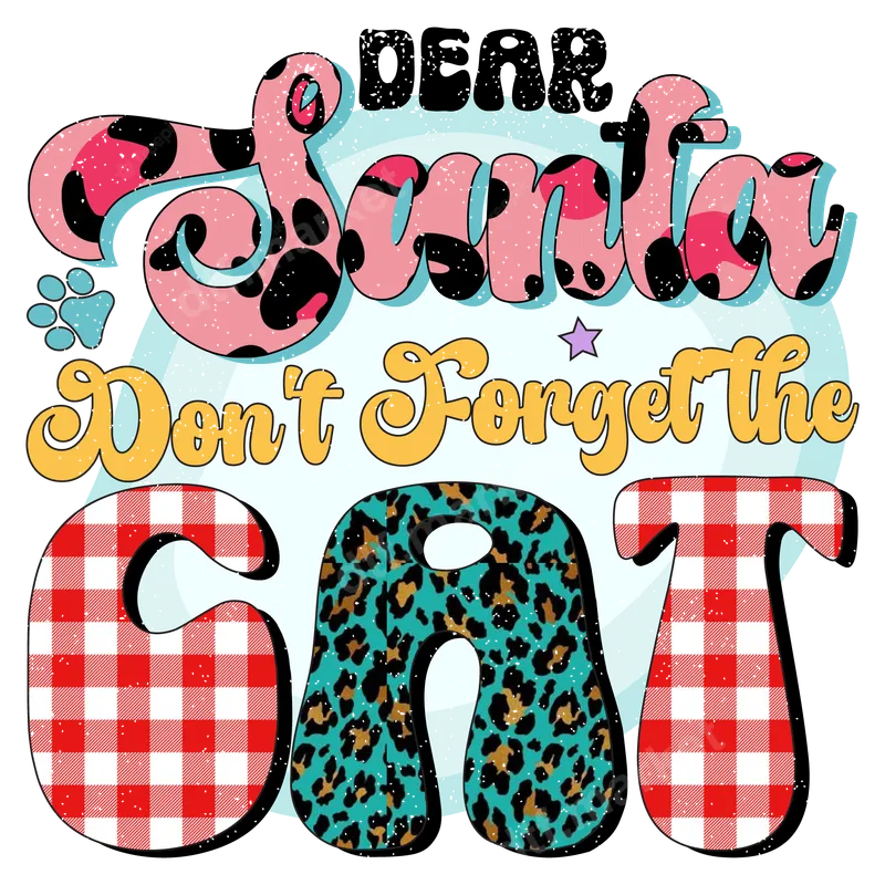 See allThis vibrant "Dear Santa Don't Forget the CAT" DTF transfer brings a playful, retro Christmas vibe to your holiday apparel. Featuring groovy lettering, a mix of leopard print and classic gingham patterns, and a distressed texture, this ready to press design is bursting with personality. It's the perfect statement piece for anyone who puts their feline friend at the top of Santa's nice list. Ideal for cat owners, pet lovers, and anyone with a great sense of humor, this heat press transfer makes a fantastic personalized gift or a fun addition to your own festive wardrobe. Create unique shirts, sweatshirts, or tote bags for Christmas parties, family gatherings, or casual holiday outings. It’s also a perfect iron on transfer for crafting personalized presents for friends and family who adore their furry companions. Applying this high-quality heat transfer is incredibly easy! Our DTF transfers work seamlessly on a wide range of materials, including cotton, polyester, and various fabric blends. For best results, use a heat press at 300-325°F for 15 seconds with medium pressure, then peel cold. You can even apply it with a household iron (follow specific instructions). Best of all, there's no weeding required, making your crafting process quick and enjoyable. Experience professional-grade results with our durable and vibrant DTF (Direct-to-Film) transfers. Each custom transfer is engineered for excellent color vibrancy, crack resistance, and a soft, comfortable feel on any garment. The specialized film and strong adhesive ensure a long-lasting, high-definition image that will withstand countless washes, keeping your apparel looking fresh and fun throughout the holiday season and beyond.