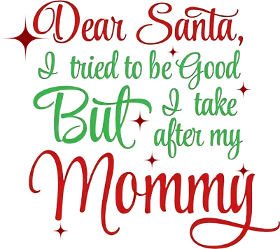 See allThe design features the playful phrase "Dear Santa, I tried to be Good But I take after my Mommy" in festive red and green script, accented with sparkling starbursts. This hilarious design captures the mischievous spirit of the holidays with a nod to a fun-loving mom. It's a vibrant, full-color DTF transfer, perfect for adding a touch of humor to your holiday apparel. This ready to press design makes crafting your festive garments simple and fun. This design is perfect for moms, daughters, and grandmothers who love a good laugh during the Christmas season. It’s ideal for family matching shirts, holiday parties, or as a unique gift for a sassy mom or a child who embodies their mother's playful spirit. Etsy t-shirt sellers and small boutique owners will find this iron on transfer a popular choice for quick-selling holiday merchandise. It's also a fantastic heat transfer design for crafters looking to create personalized Christmas gifts that stand out. Applying this heat press transfer is incredibly easy, working beautifully on cotton, polyester, cotton-poly blends, and even nylon fabrics. Simply use a heat press at 300-325°F for 15 seconds with medium pressure, or apply with a household iron. There's no weeding required – just peel and press! It’s perfect for custom t-shirts, cozy hoodies, festive sweatshirts, tote bags, and even baby onesies for a memorable first Christmas. For lasting durability, wash garments inside out and tumble dry on low heat. Experience premium quality with this ready to press transfer, featuring vibrant, full-color printing and exceptional fine detail. Our transfers are crack-resistant, soft to the touch, and avoid the heavy, stiff feel often associated with vinyl. Each direct to film transfer is produced on high-quality DTF film with a robust adhesive backing, ensuring professional-looking results on every garment, every time.