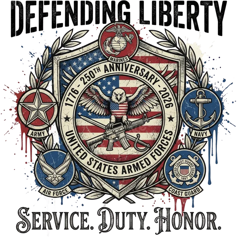 See allThis powerful DTF transfer proudly commemorates the 250th Anniversary of the United States Armed Forces, spanning from 1776 to 2026. The design features a majestic American flag shield with an eagle holding a rifle and sword, encircled by olive branches and emblems representing the Army, Navy, Air Force, Marines, and Coast Guard. Bold text declares "DEFENDING LIBERTY" and "SERVICE. DUTY. HONOR.", making this a truly impactful, ready to press design for any patriotic apparel. This patriotic heat transfer is ideal for veterans, active duty military personnel, military families, and anyone who wants to proudly display their support for the US Armed Forces. It's perfect for commemorating patriotic holidays like the 4th of July, Memorial Day, Veterans Day, or Armed Forces Day. It also makes a thoughtful gift for military retirements, deployments, or simply to show appreciation for those who serve our nation. Our versatile iron on transfer is designed for easy application on a wide range of fabrics, including cotton, polyester, and various blends. For best results, use a heat press at 300-325°F for 15 seconds with medium pressure, then perform a cool peel. Alternatively, a household iron can be used with careful attention to pressure and even heat. Enjoy the simplicity of no weeding or masking required, making your custom apparel projects quick and effortless. Experience superior quality with this professional t-shirt transfer, crafted using premium DTF film and inks. The result is a vibrant, crack-resistant design that maintains its stunning detail and color even after multiple washes. Our transfers boast a soft hand feel and strong adhesive, ensuring your custom design adheres securely and comfortably to your garment for long-lasting wear.