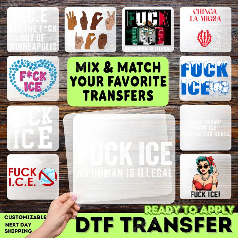 See allMake a powerful statement with this explicit anti-ICE DTF transfer, featuring bold slogans like 'F*CK ICE,' 'No Human Is Illegal,' and 'CHINGA LA MIGRA.' Each ready to press design embodies defiance and solidarity, available in various styles including distressed typography, ASL interpretations, and a vintage pin-up giving a strong message. These designs are perfect for those who want to express their unwavering stance on immigration rights and social justice through their apparel. This collection of designs is ideal for political activists, human rights advocates, protestors, or anyone dedicated to raising awareness and expressing strong views against injustice. Whether you're attending a rally, participating in a protest, or simply want to make an everyday political statement, these transfers provide a clear voice. They also make impactful gifts for like-minded friends, family members, or fellow community organizers. Applying this high-quality heat press transfer is simple and efficient. It works seamlessly on a wide range of materials, including cotton, polyester, and their blends. For best results, use a heat press at 300-325°F for 15 seconds with medium pressure. A household iron on transfer method can also be used with care. There's no need for tedious weeding, saving you time and effort to focus on your message. Our professional-grade DTF transfer film ensures vibrant, long-lasting results that resist cracking and peeling, even after multiple washes. The designs have a soft hand feel, blending smoothly with the fabric to provide maximum comfort while delivering a powerful message. This durable t-shirt transfer allows you to wear your convictions with pride and clarity.