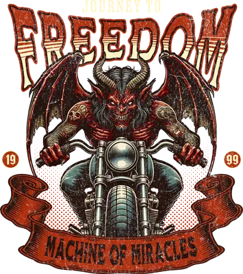 See allEmbrace the open road and a rebellious spirit with this striking Demon Rider 'Journey to Freedom' DTF transfer. Featuring a horned, winged demon with intricate tattoos, fiercely riding a vintage motorcycle, this design captures an edgy, gothic biker aesthetic. The distressed lettering for "JOURNEY TO FREEDOM" and "MACHINE OF MIRACLES" adds to its raw, vintage appeal, making it a powerful statement piece ready to press onto your favorite apparel.
