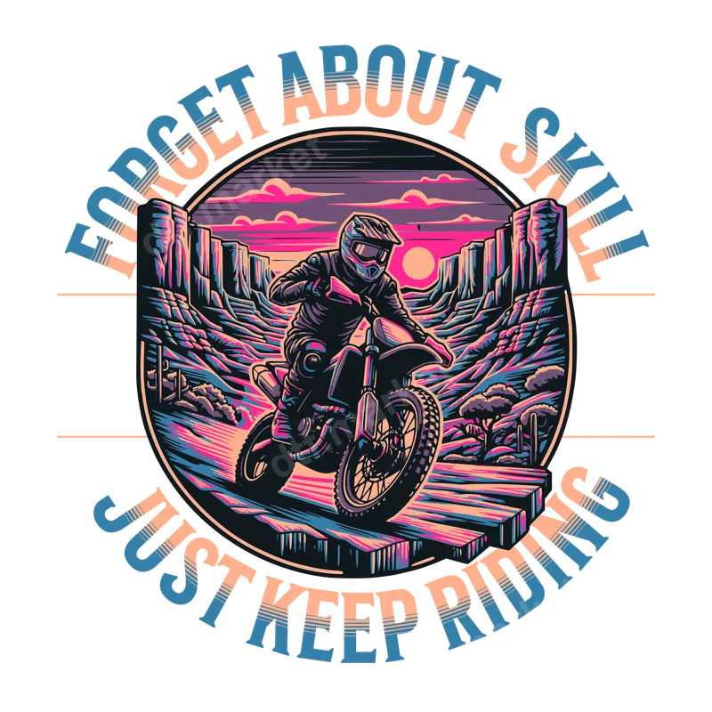 See allCapture the thrill of the ride with this striking motocross DTF transfer, featuring a dirt bike rider blazing through a vibrant, neon-hued desert canyon at sunset. The bold graphic is framed by the empowering motto, 'FORGET ABOUT SKILL JUST KEEP RIDING,' making it a perfect statement piece for any enthusiast. This high-quality DTF transfer is ready to press, ensuring a professional and durable finish on your chosen apparel. This unique design is ideal for dirt bike racers, motocross fans, off-road adventurers, and anyone who lives for the adrenaline of the open trail. It makes an exceptional gift for birthdays, Father's Day, or simply to celebrate a passion for extreme sports. Elevate your wardrobe for rallies, track days, or casual wear, expressing your dedication to the ride. Applying your new heat transfer is simple and straightforward. Our direct to film transfers adhere beautifully to a wide range of fabrics, including cotton, polyester, and cotton-poly blends. For best results, use a heat press at 300-325°F for 15 seconds with medium pressure. No weeding or complicated setup is required; just press and peel for an instant custom look. It can also be applied with a household iron with care. Experience superior quality with our professional-grade apparel transfer. This ready to press design boasts incredibly vibrant colors that pop, along with exceptional durability, resisting cracks and fading even after multiple washes. The soft-touch finish integrates seamlessly with the fabric, providing comfortable wear that feels like part of the garment. Transform any item into a personalized piece with this eye-catching iron on decal.