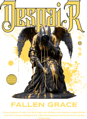 The design features a dramatically posed, dark hooded angel-like figure, heavily draped in what appears to be golden or yellow paint drips and splatters. Above, the word "DESPAIR" is rendered in a bold, gothic typeface, complemented by "FALLEN GRACE" below, and a poignant description of a "dark angel... embodying tragic beauty and profound sorrow." This expressive DTF transfer perfectly captures a melancholic and edgy aesthetic, making it a powerful ready to press design for those who appreciate deep symbolic art. This unique design is ideal for individuals who gravitate towards gothic art, dark academia, streetwear fashion, or alternative styles. It's perfect for crafting custom apparel for music festivals, art events, or as a statement piece for everyday wear. Small boutique owners, crafters, and Etsy sellers looking for distinctive heat transfer designs will find this an eye-catching option for their inventory. It makes a thoughtful gift for friends who appreciate profound artistic expressions or unique iron on transfers. Applying this striking heat press transfer is simple and efficient, suitable for a wide range of materials including cotton, polyester, cotton-poly blends, and even nylon. Achieve professional results using a heat press set at 300-325°F for 15 seconds with medium pressure, or apply with a household iron. There’s no tedious weeding required—simply peel and press! It's perfect for custom t-shirts, hoodies, sweatshirts, tote bags, pillow covers, and even denim jackets, allowing you to personalize almost any fabric item. For lasting durability, wash garments inside out and tumble dry on low heat. Experience superior quality with this ready to press transfer, boasting vibrant, full-color printing and exceptional fine detail that truly brings the art to life. The design is crack-resistant and soft to the touch, ensuring no heavy vinyl feel. Each direct to film transfer is meticulously printed on premium DTF film, featuring a strong adhesive backing for professional, long-lasting results that will stand out on any garment or accessory.