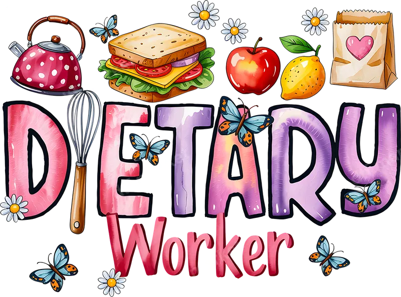 See allThis delightful DTF transfer showcases the words 'DIETARY Worker' in fun, vibrant, multi-colored lettering, creatively accented with a whisk, polka dot kettle, wholesome sandwich, crisp apple, fresh lemon, and a charming lunch bag. Adorned with delicate butterflies and daisies, this design exudes a cheerful and appreciative vibe, making it a perfect ready to press transfer for anyone in the dietary field. It’s an ideal way to celebrate the essential work of food service professionals with a touch of whimsy and bright colors. This design is perfect for dietary aides, kitchen staff, food service managers, dietitians, nutritionists, and anyone who plays a vital role in providing meals and nutritional care. It makes a thoughtful appreciation gift, a unique uniform accent, or a great piece for team-building events and professional gatherings. Celebrate their dedication and hard work with a design that truly stands out, reflecting the importance of their daily contributions. Our premium DTF transfers are incredibly versatile, adhering beautifully to a wide range of fabrics including cotton, polyester, and their blends. Application is simple: use a heat press at 300-325°F for 15 seconds with medium pressure. For hobbyists, a household iron can also be used following careful instructions. This versatile apparel transfer can be applied using a professional heat press or even a household iron, making it a perfect ready to press transfer for any crafting skill level. Unlike traditional vinyl transfers, there's no tedious weeding required, ensuring a quick and easy application process. Each heat press transfer is crafted from high-quality DTF film, ensuring vibrant colors that pop and a soft-to-the-touch finish. Our transfers are crack-resistant, durable, and designed to withstand countless washes, maintaining their professional appearance over time. Provide your team with long-lasting, comfortable, and eye-catching custom shirts or bags that truly honor their profession.