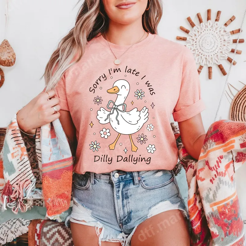 See allThis adorable DTF transfer features a charming cartoon duck, complete with a cute bow tie, waddling amidst a sprinkle of flowers and sparkles. The playful text reads, "Sorry I'm late I was Dilly Dallying," making it the perfect statement piece for anyone with a lighthearted approach to punctuality. This ready to press design brings a whimsical and humorous touch to any garment, guaranteed to spark smiles and knowing glances. Ideal for friends, family, or anyone who enjoys a good chuckle, this heat press transfer is fantastic for everyday wear, casual outings, or as a thoughtful gift. It's especially suited for those who embrace a relaxed pace of life, often finding themselves a little behind schedule in the most charming way. Perfect for birthdays, white elephant gift exchanges, or just a fun surprise for a loved one. Our direct to film transfer is incredibly versatile and works beautifully on a wide range of materials, including cotton, polyester, and various blends. Applying your new shirt design is a breeze: simply use a heat press at 300-325°F for 15 seconds with medium pressure, or even a household iron for smaller applications. The best part? There's absolutely no tedious weeding required, making custom apparel creation quick and easy. Experience professional-grade results with our premium quality DTF transfer. Each iron on transfer boasts incredibly vibrant colors, exceptional durability, and resistance to cracking, ensuring your design looks fantastic wash after wash. The finished product feels soft to the touch, seamlessly integrating with the fabric. Create stylish, long-lasting apparel with our reliable and high-performance DTF transfers.