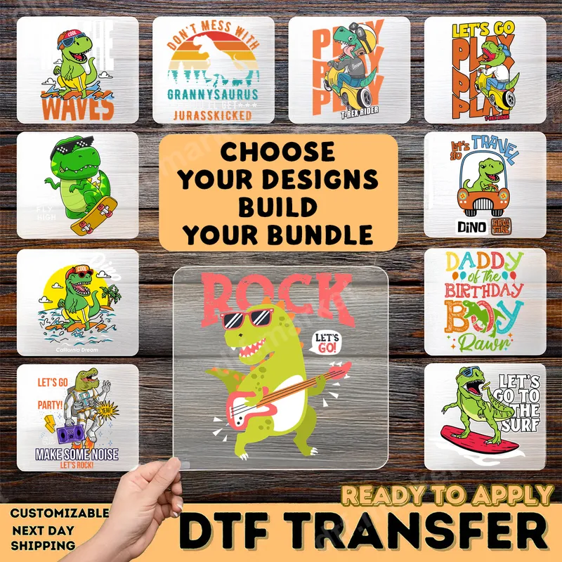 See allGet ready to rock and roar with this vibrant Dino Rock Star DTF transfer! Featuring a cool green dinosaur sporting sunglasses and shredding on an electric guitar, this design is all about fun, music, and prehistoric coolness. The bold 'ROCK' text and energetic 'LET'S GO!' perfectly capture the lively spirit of this prehistoric rock star. This high-quality direct to film transfer is ready to press, making it easy to add a dynamic touch to any garment or accessory. This playful heat press design is perfect for kids who love dinosaurs and music, or for adults who enjoy a touch of nostalgic fun. It's an ideal choice for birthday parties, school events, casual wear, or as a unique gift for any budding rock enthusiast. Imagine this awesome dino gracing t-shirts for band practice, hoodies for playdates, or even tote bags for everyday adventures. It's a fantastic way to express a love for both dinosaurs and rock 'n' roll. Applying this professional heat transfer is incredibly straightforward. It works seamlessly on a wide range of fabrics including cotton, polyester, and various blends, ensuring versatility for your projects. For best results, use a heat press at 300-325°F for 15 seconds with medium, even pressure. This iron on transfer also boasts the convenience of no weeding required, saving you time and effort. Simply peel, press, and admire your new custom creation! Our Dino Rock Star apparel transfer is engineered for durability and exceptional visual appeal. You'll love the vibrant colors that pop and the impressive crack-resistant finish, ensuring your design looks great wash after wash. The soft-to-touch feel means comfort isn't compromised, making it feel like part of the fabric itself. Crafted using professional DTF film with a strong, reliable adhesive, this ready to press transfer provides a high-quality, long-lasting embellishment that truly stands out.