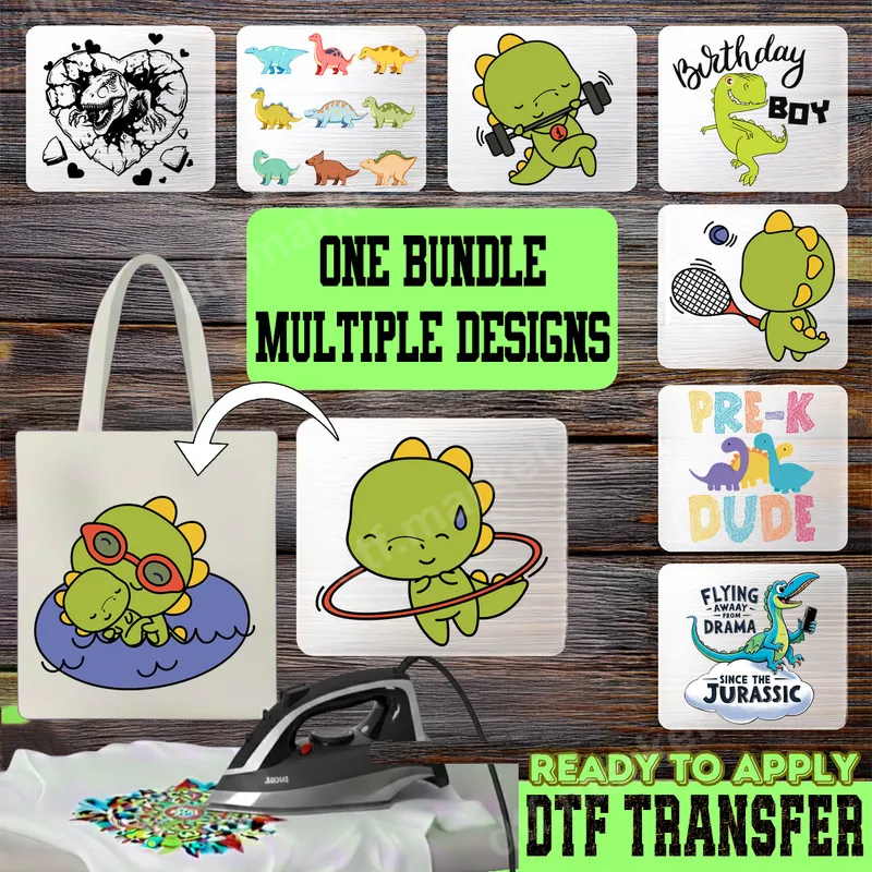 See allThis exclusive DTF transfer bundle brings a roar of fun to your wardrobe! Featuring a collection of unique dinosaur-themed designs, this ready to press transfer pack offers styles from adorable cartoon dinos lifting weights and playing tennis to a fierce T-Rex heart graphic and a witty "Flying Away From Drama Since The Jurassic" meme. Each design is vibrant and eye-catching, perfect for creating personalized apparel. This versatile collection is ideal for dinosaur lovers of all ages, from preschoolers to adults. Create custom "Birthday Boy" shirts, celebrate a "Pre-K Dude," or make unique gifts. They’re perfect for themed parties, casual wear, back-to-school outfits, or just adding prehistoric charm. Imagine cool custom t-shirts for kids' events or funny iron on transfers for any dinosaur enthusiast. Applying your new DTF designs is incredibly simple, making them a fantastic choice for both beginners and experienced crafters. These high-quality direct to film transfers adhere beautifully to cotton, polyester, and various fabric blends. For best results, use a heat press at 300-325°F for 15 seconds with medium pressure. A household iron can also be used for smaller applications. No weeding required, saving you time! Experience the superior quality of our professional DTF film. These heat press transfers are designed for durability, offering vibrant colors, exceptional stretch, and crack-resistant finishes that stand up to repeated washes. The strong adhesive ensures a long-lasting bond to your garments, resulting in a soft-to-touch finish that feels like part of the fabric. Elevate your apparel with these premium, ready to press designs.