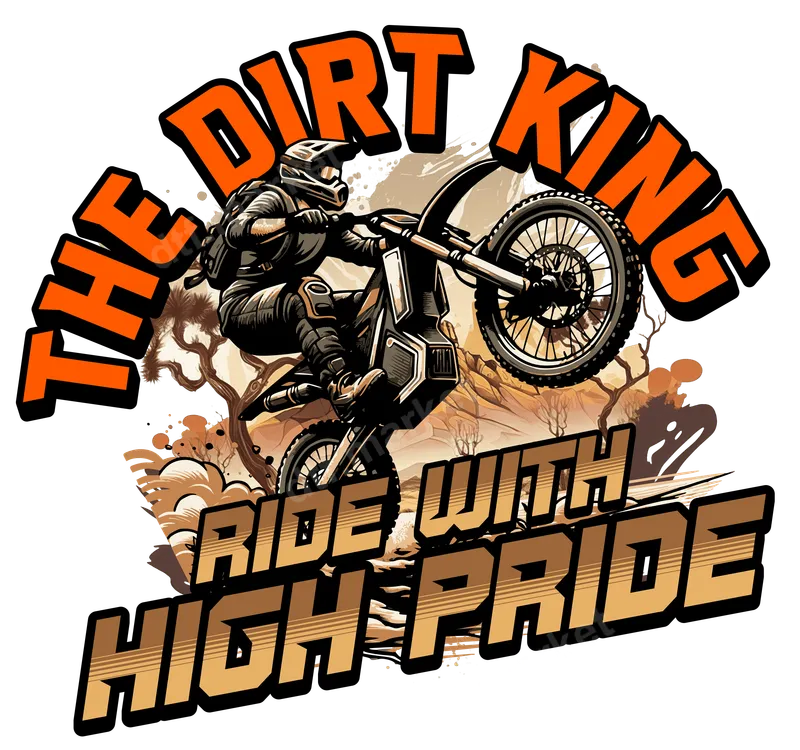 See allThis striking DTF transfer features a powerful illustration of a motocross rider mid-wheelie, exuding adrenaline and skill. Bold text declares "THE DIRT KING" above and "RIDE WITH HIGH PRIDE" below, set against an earthy, dusty background. This ready to press design is perfect for those who live for the thrill of the ride, capturing the essence of off-road adventure with vibrant detail. Ideal for motocross enthusiasts, dirt bike riders, and fans of extreme sports, this heat press transfer makes a fantastic statement piece. It's an excellent gift for dads, sons, or friends who love off-roading, perfect for birthdays, Father's Day, or just to celebrate their passion. Apply this design to custom apparel for races, casual wear, or club events to showcase your spirit. Applying this high-quality iron on transfer is simple with a heat press. Press at 300-325°F for 15 seconds with medium pressure. It works seamlessly on a wide range of materials, including cotton, polyester, and their blends, making it versatile for many garments. No tedious weeding is required, saving you time and effort for a professional finish. Our direct to film transfer ensures a vibrant, long-lasting finish that resists cracking and peeling, even after multiple washes. The professional-grade DTF film provides exceptional color payoff and a soft hand feel, making your customized t-shirt transfer comfortable to wear. Experience durable, professional-quality results every time with this incredible heat press design.