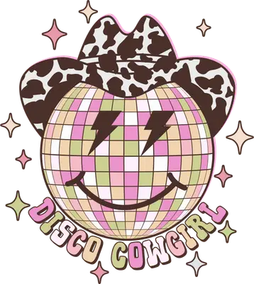 Disco Cowgirl DTF Transfer | Cow Print Hat & Disco Ball Smiley