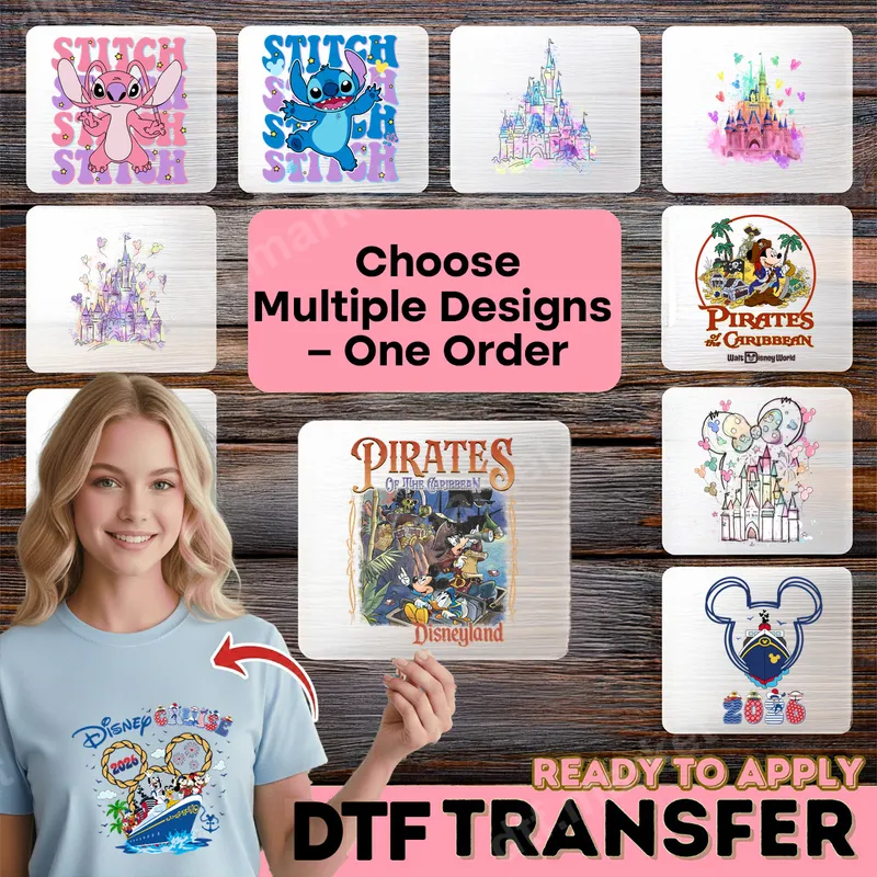 See allThis collection offers a magical assortment of Disney-themed DTF transfers, perfect for adding beloved characters and iconic landmarks to your apparel. Featuring playful designs of Stitch and Angel, enchanting Cinderella Castle artwork, classic Pirates of the Caribbean scenes, and even a special Disney Cruise design, each ready to press transfer brings a touch of fantasy to your creations. These high-quality DTF transfers capture the vibrant spirit of Disney, ensuring your custom items stand out with professional-grade appeal. These versatile heat transfers are ideal for Disney enthusiasts, theme park visitors, and anyone planning a magical vacation. Perfect for family trips to Disneyland or Walt Disney World, Disney cruises, birthday parties, or creating unique personalized gifts. Crafters and small business owners will also find these iron on transfers excellent for producing custom merchandise for fans of all ages, from kids to adults. Applying your chosen design is effortless, making it perfect for both beginners and experienced crafters. Our direct to film transfers adhere beautifully to a wide range of fabrics, including cotton, polyester, and various blends. For best results, use a heat press at 300-325°F for 15 seconds with medium pressure, then peel cold. You can also achieve great results with a household iron, simply follow included instructions. Enjoy the convenience of a heat press ready design with no weeding or layering needed. Experience superior quality with our premium apparel transfers. Each design is printed using professional-grade DTF film and vibrant, durable inks, ensuring vivid colors that resist cracking and fading even after multiple washes. The strong adhesive creates a soft, flexible finish that integrates seamlessly with your garment, providing a comfortable feel and a long-lasting, professional look. These t-shirt transfers are designed to deliver exceptional results every time.