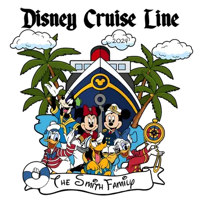 See allThis DTF transfer captures the excitement of a Disney Cruise Line vacation, featuring beloved characters Mickey Mouse, Minnie Mouse, Goofy, Donald Duck, Daisy Duck, and Pluto, all dressed in festive nautical attire. They gather joyfully in front of a majestic Disney Cruise ship, flanked by tropical palm trees and clouds, with "Disney Cruise Line" prominently displayed and "2024" subtly noted, along with a banner for "The Smith Family". This vibrant, ready to press design evokes feelings of adventure, family fun, and tropical relaxation, making it the perfect keepsake for an unforgettable journey. This magical design is perfect for families planning or reminiscing about their 2024 Disney Cruise vacation, Disney enthusiasts, and groups looking to create matching apparel for their trip. It serves as an ideal iron on transfer for crafting personalized shirts for everyone from kids to grandparents, making gift-giving easy for travel reveals or pre-trip excitement. Small t-shirt businesses and crafters can also utilize this charming heat transfer design to offer unique, custom merchandise. Applying this heat press transfer is simple and offers professional results on a variety of fabrics including cotton, polyester, cotton-poly blends, and even nylon. For best results, use a heat press at 300-325°F for 15 seconds with medium pressure. A household iron can also be used with firm, even pressure. This is a no-weeding transfer; just peel and press! It’s perfect for custom t-shirts, hoodies, sweatshirts, tote bags, pillow covers, baby onesies, aprons, and denim jackets. For lasting durability, wash garments inside out and tumble dry low. Each ready to press transfer ensures vibrant, full-color printing with exceptional detail, bringing your favorite Disney characters to life. Our direct to film transfer technology results in a crack-resistant and soft-to-the-touch finish, without the heavy, stiff feel of traditional vinyl transfers. Printed on premium DTF film with a strong adhesive backing, these apparel transfers guarantee professional-quality results every time, ready to transform your garments.
