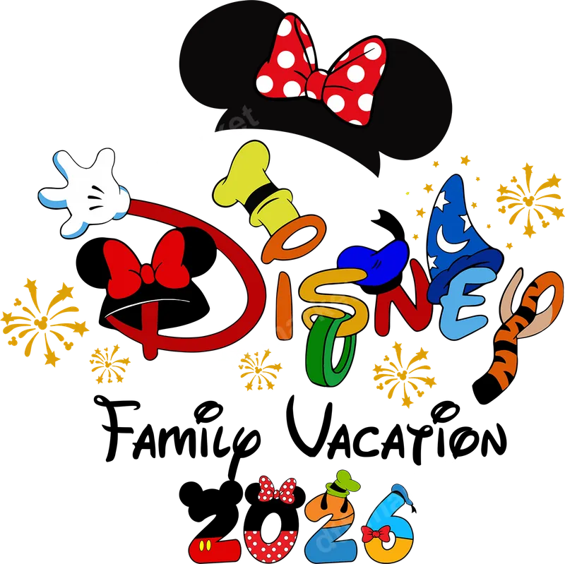 See allThis cheerful and vibrant DTF transfer captures the excitement of a Disney family vacation in 2026. The iconic "DISNEY" lettering is cleverly designed with elements from beloved characters like Mickey, Minnie, Donald, Goofy, and even Sorcerer Mickey, surrounded by festive fireworks. Below, "Family Vacation 2026" is spelled out with fun character accents for the numbers. This ready to press design is perfect for creating matching apparel for your magical adventure. Ideal for families planning a trip to Disney World or Disneyland in 2026, this iron on transfer is a fantastic way to create coordinated outfits. Perfect for group photos, park hopping, or simply celebrating your upcoming magical journey. It makes a wonderful surprise gift for family members or a fun project to prepare for your vacation, ensuring everyone looks unified and festive. Our direct to film transfer is incredibly versatile, applying beautifully to cotton, polyester, and various fabric blends. For best results, use a heat press at 300-325°F for 15 seconds with medium pressure, then peel cold. You can also achieve great results with a household iron; simply ensure even pressure and adequate heat. Enjoy a hassle-free application process with no weeding required, making custom shirt designs effortless. Experience premium quality with this professional DTF film. The colors are exceptionally vibrant and crisp, ensuring your apparel transfer stands out. Designed to be durable and crack-resistant, these transfers maintain their pristine look even after many washes. The soft-touch feel integrates seamlessly with the fabric, providing a comfortable wear that feels like part of the garment itself.