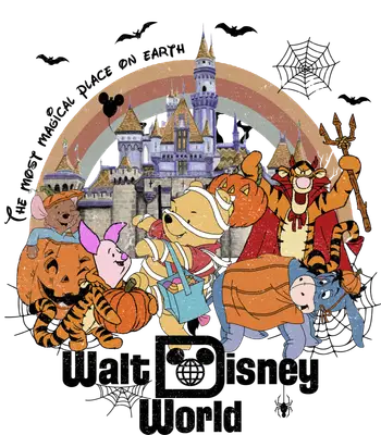 See allEmbrace the magic and mischief of Halloween with this charming DTF transfer featuring Winnie the Pooh and his friends from the Hundred Acre Wood. This vibrant design showcases Pooh as a mummy, Tigger as a playful devil, Eeyore as a friendly ghost, and Piglet and Roo with their pumpkins, all set against a whimsical distressed Disney castle backdrop with a rainbow, bats, and spiderwebs. The iconic phrases "THE MOST MAGICAL PLACE ON EARTH" and "Walt Disney World" are prominently displayed, capturing the spirit of a spooky Disney vacation. This full-color design is a ready to press DTF transfer, perfect for adding a touch of enchantment to your apparel. This delightful design is perfect for Disney enthusiasts, Winnie the Pooh fans, families planning a Halloween trip to Walt Disney World, or crafters looking to create unique themed merchandise. It's an ideal iron on transfer for making matching family shirts, personalized gifts, or adding festive flair to your wardrobe for fall events and trick-or-treating. Whether you're heading to a Disney park or just love the characters, this transfer captures the joyous spirit of a Disney Halloween. Applying this heat press transfer is incredibly easy! It adheres seamlessly to a wide range of fabrics including cotton, polyester, cotton-poly blends, and even nylon. Simply use a heat press (recommended at 300-325°F for 15 seconds with medium pressure) or a household iron. No weeding required – just peel and press for a professional finish. This versatile t-shirt transfer is perfect for custom t-shirts, hoodies, sweatshirts, tote bags, pillow covers, baby onesies, aprons, and denim jackets. For long-lasting durability, wash garments inside out and tumble dry on low heat. Experience premium quality with this ready to press transfer. It features vibrant, full-color printing that captures every fine detail of the beloved characters and the magical castle scene. Our transfers are crack-resistant and soft to the touch, avoiding the heavy, stiff feel often associated with traditional vinyl. Each direct to film transfer is printed on high-quality DTF film with a strong adhesive backing, ensuring professional-grade results that stand out and last through countless adventures.