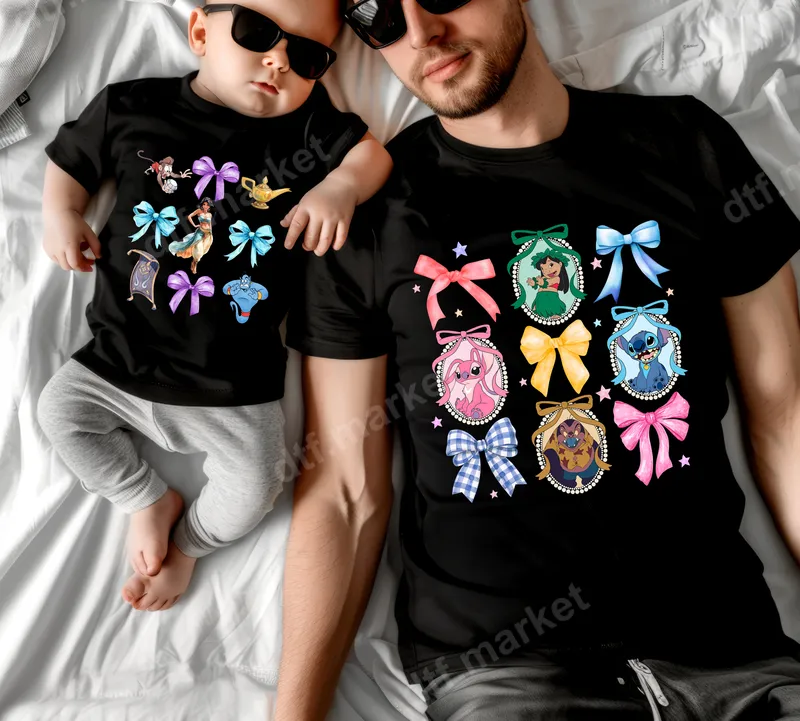 See allBring the magic of Disney to life with this charming DTF transfer featuring beloved characters from Lilo & Stitch and Aladdin. This ready to press design showcases Stitch, Angel, Lilo, Jasmine, Genie, Abu, the Magic Carpet, and Jafar in genie form, all framed within vibrant bows and sparkling stars. Perfect for creating custom apparel, this high-quality direct to film transfer is sure to delight fans of all ages. This whimsical heat transfer is ideal for Disney enthusiasts, families, and parents looking for adorable matching outfits. It's perfect for family vacations to theme parks, birthday celebrations, baby showers, or as a thoughtful gift for new parents. Create unique t-shirts, hoodies, or baby bodysuits that capture the fun and fantasy of these classic animated tales. Applying this heat press transfer is simple and efficient. It works beautifully on a variety of fabrics including cotton, polyester, and blends. For best results, use a heat press at 300-325°F for 15 seconds with medium pressure. It can also be applied with a household iron (follow specific instructions for best results). No tedious weeding or layering is required, making your custom projects quick and enjoyable. Experience professional-grade quality with every apparel transfer. Our DTF transfers are known for their vibrant, true-to-color designs that resist cracking and peeling, even after multiple washes. The soft-touch feel ensures maximum comfort, while the strong adhesive guarantees a long-lasting heat press design that will make your garments stand out.