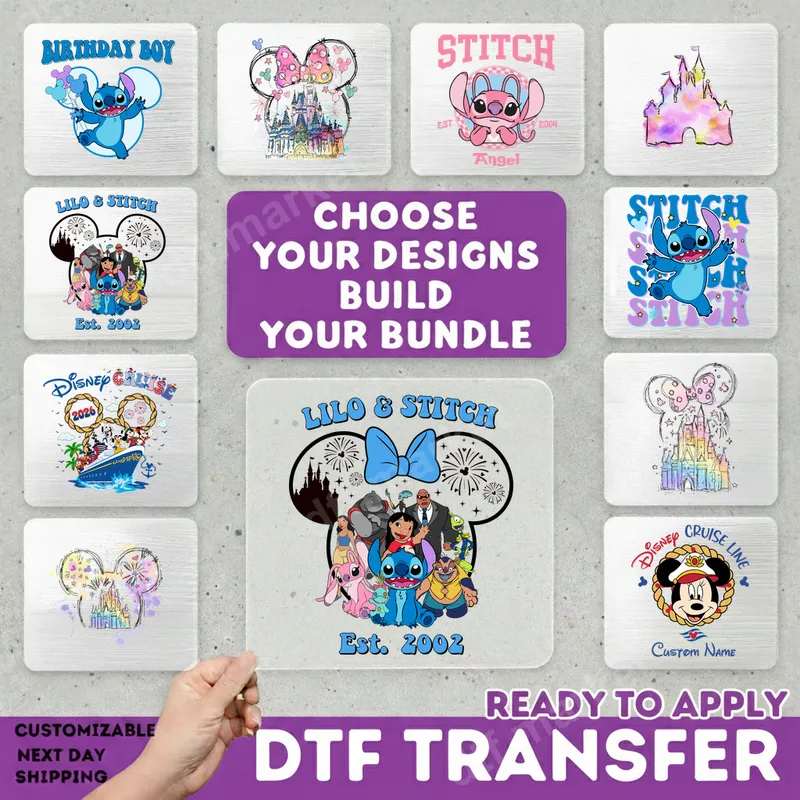 See allExplore our enchanting collection of Disney-inspired DTF transfers, perfect for adding a touch of magic to your apparel. This diverse range features beloved characters like Lilo and Stitch in various playful scenes, including a 'Birthday Boy' design and classic group shots. You'll also find iconic Disney castles rendered in beautiful watercolor and outline styles, along with charming Disney Cruise Line designs starring Mickey Mouse. Each design is a high-quality, ready to press heat transfer, ensuring vibrant results for your custom projects. These versatile heat press designs are ideal for Disney enthusiasts of all ages, from families planning a magical vacation to theme parks or a memorable Disney Cruise. They make fantastic additions to birthday celebrations, family reunions, or simply for showcasing your love for Disney in your everyday wardrobe. Gift them to friends or family who adore Lilo & Stitch, or use them to create personalized gifts that will surely bring a smile to any Disney lover's face. Applying these iron on transfers is incredibly simple, designed for both professional and home use. Our direct to film transfers adhere beautifully to a wide array of fabrics, including cotton, polyester, and various blends. For best results, use a heat press at 300-325°F for 15 seconds with medium pressure. These t-shirt transfers can also be applied with a household iron, making customization accessible to everyone. Enjoy the convenience of no weeding or masking required, just press and peel! Experience superior quality with our premium apparel transfers. Each design boasts incredibly vibrant colors that pop, along with excellent durability, resisting cracks and peels even after multiple washes. Our professional DTF film ensures a soft hand feel, so your custom garments remain comfortable to wear. With a strong, reliable adhesive, these designs bond securely to your chosen fabric, guaranteeing a long-lasting, professional finish for all your custom creations.