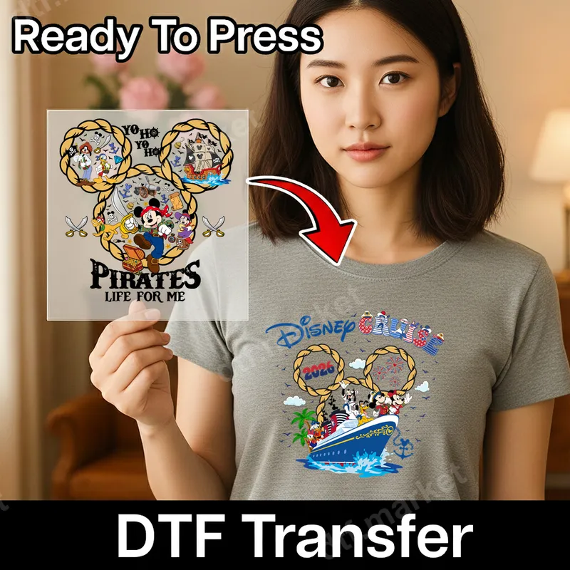 See allThis vibrant Disney Pirates Life For Me DTF transfer brings swashbuckling fun to any garment. Featuring classic characters like Mickey Mouse, Minnie, Donald, and Goofy dressed as adventurous pirates, the design is framed within a unique rope-style Mickey head emblem. With iconic phrases like "YO HO YO HO" and "PIRATES LIFE FOR ME," this ready to press design perfectly captures high-seas adventure and Disney magic. It’s an ideal choice for adding playful rebellion and character to your apparel. This Disney pirate heat transfer is perfect for fans of all ages, especially those who love the Pirates of the Caribbean ride or pirate themes. It makes an excellent addition to outfits for Disney park visits, cruise trips, themed parties, or family vacations. Give the gift of custom apparel to a friend, child, or enthusiast who dreams of a pirate's life, or create unique merchandise for a Disney-themed event. Applying this direct to film transfer is straightforward and hassle-free. Our high-quality iron on decal works seamlessly on cotton, polyester, and blends. For best results, use a heat press at 300-325°F for 15 seconds with medium pressure. This durable t-shirt transfer can also be applied with a household iron, making customization accessible. No tedious weeding; this heat press design is ready to press straight out of the package. Experience superior quality with our professional-grade DTF transfers. Each design boasts incredibly vibrant colors and sharp details that truly pop on any fabric. Engineered for durability, these transfers are crack-resistant, fade-resistant, and offer a soft-to-the-touch finish that feels like part of the garment. Made with strong adhesive on premium DTF film, your custom apparel will withstand countless washes.
