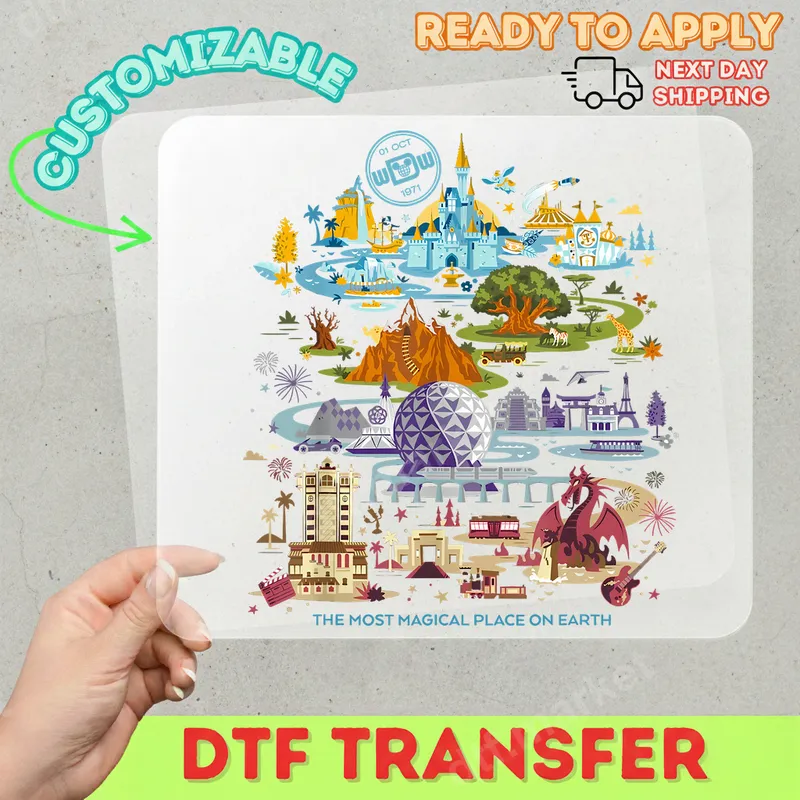 See allThis vibrant DTF transfer captures the essence of "The Most Magical Place On Earth" with a beautifully illustrated map showcasing iconic landmarks. From Cinderella Castle to Spaceship Earth, this design artfully combines elements from all four beloved parks. Featuring the "01 OCT 1971" founding date, it’s a detailed, nostalgic piece that's ready to press onto your favorite apparel. This high-quality direct to film transfer brings a touch of fantasy to any garment. This unique heat press transfer is ideal for Disney fans of all ages, theme park enthusiasts, and families planning a magical vacation. It makes a fantastic gift for birthdays, anniversaries, or as a special souvenir. Personalize t-shirts, hoodies, or tote bags for a family reunion at the parks. It’s also perfect for crafters creating unique items or cherished keepsakes. Applying your new apparel transfer is simple and efficient. This ready to press transfer works seamlessly on a wide range of materials, including cotton, polyester, and blends. For best results, use a heat press between 300-325°F for 15 seconds with medium pressure. If a heat press isn't available, a household iron can also be used. No weeding required – just press and peel for a perfect finish. Our iron on transfers are crafted using professional-grade DTF film and vibrant, durable inks that resist cracking and fading, ensuring your design looks fantastic wash after wash. The finished transfer boasts a soft, lightweight feel, comfortable on any garment. Strong adhesive ensures excellent adhesion and longevity, providing a professional-quality custom transfer that will last for years.