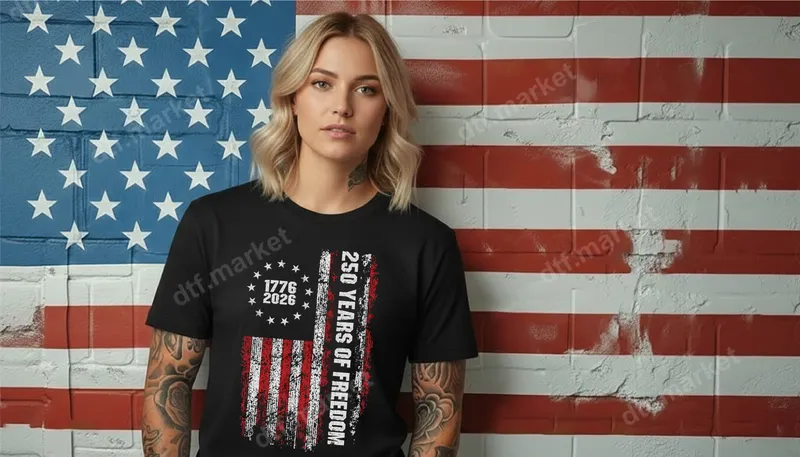 See allShow your unwavering patriotism with this striking Distressed 250 Years of Freedom American Flag DTF transfer. This unique design proudly commemorates the milestone from 1776 to 2026, featuring a weathered US flag motif with stars encircling the historic dates and “250 YEARS OF FREEDOM” boldly displayed. It's a high-quality, ready to press DTF transfer that brings a timeless, resilient spirit to any garment. This powerful heat transfer is perfect for patriots, veterans, history enthusiasts, and anyone proud of American heritage. Ideal for celebrating the 4th of July, Memorial Day, Veterans Day, or simply for everyday wear to express your love for the USA. It also makes a thoughtful and impactful gift for military families and American citizens who cherish liberty and independence. Applying this durable heat transfer is simple with either a professional heat press or a household iron. For best results, use a heat press at 300-325°F for 15 seconds with medium pressure. This versatile iron on transfer works seamlessly on a wide range of fabrics, including cotton, polyester, and their blends, making it perfect for custom apparel projects. Enjoy the convenience of no weeding required for a quick and easy application. Our professional-grade DTF transfers deliver vibrant colors, exceptional durability, and a soft-to-the-touch finish that won't crack or peel. Crafted from premium DTF film with strong adhesive, this heat press transfer ensures your designs look fantastic and last wash after wash. Transform your wardrobe with a design that truly stands for freedom.