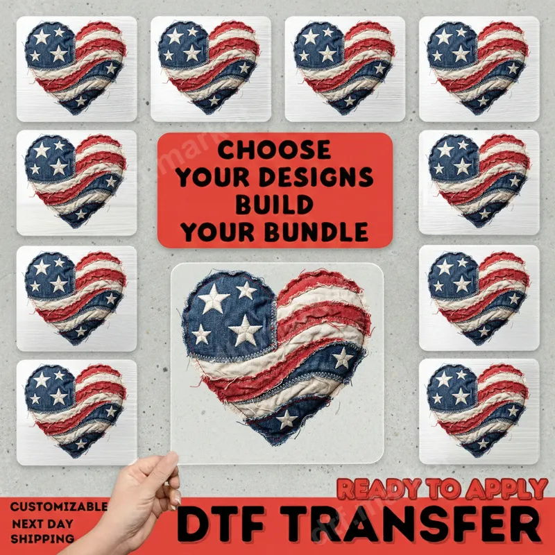 See allEmbrace a timeless patriotic style with this unique distressed American Flag Heart DTF transfer. This design beautifully captures the essence of rustic charm, featuring a heart shaped like the USA flag with a worn, fabric-like texture, complete with red and white stripes and a blue field of stars. This high-quality ready to press transfer is perfect for adding a touch of Americana to any garment or accessory, providing a distinctive and heartfelt statement of national pride. This versatile design is ideal for a wide range of individuals and occasions. It makes a fantastic heat transfer for celebrating the 4th of July, Memorial Day, or Veteran's Day, and is also perfect for everyday wear to show your love for the USA. It's a thoughtful gift for veterans, military families, history enthusiasts, or anyone who cherishes American values. Add this charming iron on transfer to your collection and wear your patriotism with pride. Our DTF transfers are incredibly easy to apply, making customization a breeze. They adhere flawlessly to a variety of fabric types, including cotton, polyester, and their blends. Simply use a heat press at 300-325°F for 15 seconds with medium pressure. For household irons, apply firm, even pressure. There's no complex weeding required, saving you time and effort so you can enjoy your custom creation faster. Experience the superior quality of our professional-grade DTF transfers. Each t-shirt transfer boasts vibrant colors that pop, exceptional crack resistance, and a soft, smooth finish that feels great against the skin. Made with durable DTF film and a strong adhesive, these apparel transfers are designed to withstand countless washes, ensuring your patriotic design remains a cherished part of your wardrobe for years to come.