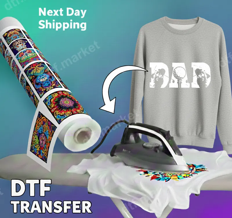 See allShow appreciation for the golf-loving dad in your life with this unique Distressed Golf Dad DTF transfer. The design features the word "DAD" in a stylish, distressed font, with the letter 'A' cleverly replaced by a golf ball on a tee, and the 'D's subtly incorporating silhouettes of golfers mid-swing. This vibrant direct to film transfer is supplied ready to press, making customization simple and professional. This premium golf-themed heat press transfer is ideal for sons, daughters, wives, and friends looking for a special gift for Father's Day, birthdays, or Christmas. Perfect for golf enthusiasts, grandfathers, and any dad who loves hitting the links, it’s a fantastic way to personalize apparel for casual wear, golf outings, or family gatherings. Create custom t-shirts, sweatshirts, or hats that celebrate his favorite sport. Our high-quality heat press transfers are incredibly versatile, designed to bond flawlessly with a wide range of fabrics including 100% cotton, 100% polyester, and various cotton/poly blends. Application is a breeze: simply use a heat press at 300-325°F for 15 seconds with medium pressure, or even a household iron for smaller projects. No weeding or complicated layering is required, allowing you to achieve professional results every time. Experience the superior quality of our DTF transfers. These iron on decals boast incredibly vibrant colors, exceptional durability, and are crack-resistant, ensuring your customized garments look great wash after wash. The soft-touch finish and strong adhesive film mean the design becomes an integral part of the fabric, providing a comfortable and long-lasting apparel transfer solution for all your creative projects.