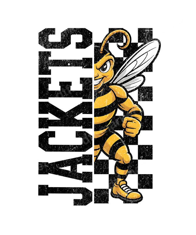 See allThis vibrant DTF transfer showcases an energetic, half-visible bee mascot, poised for action. Featuring a mischievous grin and brawny arms, this yellow and black striped character stands against a distressed black and white checkerboard pattern. The bold, vertically stacked "JACKETS" text, in a gritty, vintage-style font, creates a powerful, spirited school or team vibe for game day or any rally. This heat transfer design is perfect for students, alumni, sports teams, or anyone cheering for a "Jackets" team or a bee mascot. It's excellent for custom spirit wear for pep rallies, sporting events, fundraisers, or reunions. Small t-shirt businesses and Etsy sellers can easily offer unique apparel. This versatile iron on transfer also makes a fantastic personalized gift for coaches, teachers, and dedicated fans, celebrating team pride. Applying this versatile heat press transfer is simple and efficient, adhering flawlessly to cotton, polyester, cotton-poly blends, and nylon. Achieve professional results with a heat press (300-325°F, 15 seconds, medium pressure) or household iron. No weeding required – just peel and press! Create custom t-shirts, hoodies, sweatshirts, tote bags, pillow covers, and denim jackets. For lasting durability, wash inside out and tumble dry low. Our ready to press transfer boasts vibrant, full-color printing with exceptional detail, ensuring your designs pop. Enjoy a crack-resistant finish that feels soft to the touch, unlike heavy vinyl. Each direct to film transfer is meticulously printed on premium DTF film, utilizing a strong adhesive backing for consistent, professional-grade results on every application. Elevate your apparel game with transfers designed for durability and visual appeal.