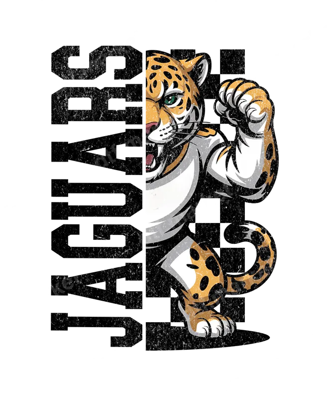 See allThis dynamic DTF transfer features a powerful jaguar mascot, flexing its bicep with an aggressive, ready-for-action stance. The "JAGUARS" text runs vertically, splitting the image, all set against a cool checkerboard background with a gritty, distressed texture. This bold aesthetic conveys strength, speed, and fierce determination, making it an ideal statement piece. This vibrant, full-color design arrives completely ready to press onto your chosen garment or accessory. This striking design is perfect for racing enthusiasts, sports teams, school mascots, or anyone who loves powerful animal imagery. It's an excellent choice for custom apparel for track day events, car shows, or athletic team uniforms. Small business owners and Etsy sellers will find this invaluable for quickly expanding their unique inventory. It also makes a fantastic iron on transfer gift for a friend or family member. Use this powerful heat transfer design to express your wild side or team pride. Applying this heat press transfer is incredibly simple for both crafters and beginners. It adheres beautifully to cotton, polyester, cotton-poly blends, and even nylon. Achieve professional results with a heat press (300-325°F, 15 seconds, medium pressure) or a household iron for smaller projects. No tedious weeding required—just peel the backing and press! Transform custom t-shirts, hoodies, sweatshirts, tote bags, and denim jackets. For lasting durability, wash inside out and tumble dry low. Experience premium quality with this ready to press transfer, showcasing vibrant, full-color printing with exceptional detail. The design is crack-resistant, ensuring it maintains its integrity, and offers a soft, lightweight feel unlike heavy vinyl. Each direct to film transfer is meticulously printed on durable, high-grade DTF film, engineered with a robust adhesive backing to deliver professional-grade results every time. Elevate your apparel with a transfer that truly stands out.