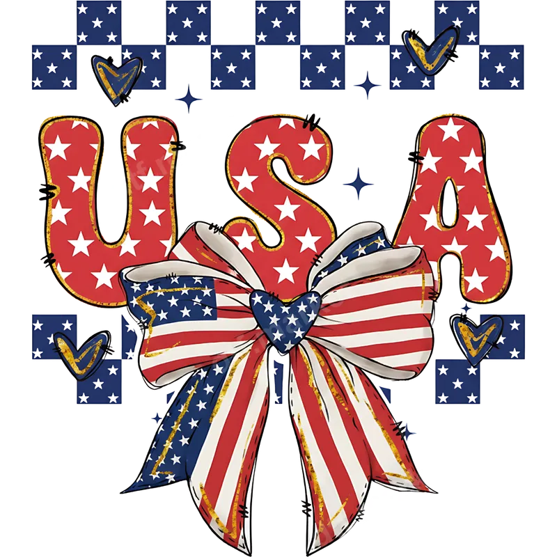 See allThis vibrant design features the word "USA" in bold, star-spangled red letters, adorned with a beautifully detailed American flag bow. The distressed golden outlines give it a vintage, handcrafted feel, complemented by subtle checkerboard star patterns and whimsical hearts in the background. This high-quality DTF transfer arrives as a stunning, ready to press decal, perfect for showcasing your patriotic spirit with style and flair. This versatile heat transfer is a must-have for anyone celebrating American pride. It's ideal for major patriotic holidays like the Fourth of July, Memorial Day, and Veteran's Day, but also perfect for election events, parades, or simply expressing your love for the USA year-round. Create unique gifts for friends and family, outfit your entire group for a patriotic event, or make a bold statement at any casual gathering. This design appeals to patriots, veterans, and anyone who appreciates Americana. Applying this ready to press transfer is incredibly easy and efficient. Designed for use with a heat press, simply apply at 300-325°F for 15 seconds with medium pressure. For those without a professional heat press, a household iron can also be used with care to achieve great results. Unlike traditional vinyl transfers, there's absolutely no weeding required – saving you time and effort. Just press, peel, and admire your new custom apparel. Experience superior quality with our direct to film transfers. Each t-shirt transfer boasts vibrant, long-lasting colors that resist cracking and peeling, ensuring your custom garments look fantastic wear after wear. The soft-touch finish integrates seamlessly with fabric, providing a comfortable feel that's far superior to thick, stiff vinyl. Our professional DTF film features a strong, reliable adhesive, guaranteeing a durable application on a wide range of materials from cotton to polyester blends.
