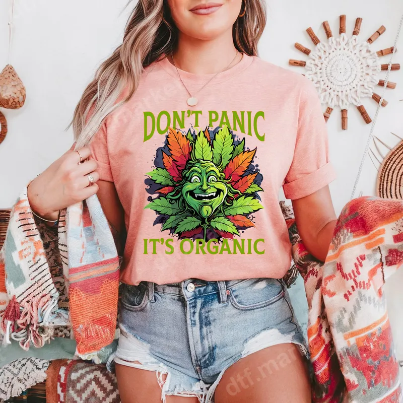 See allThis vibrant DTF transfer features a grinning, mischievous green face artfully formed from cannabis leaves, surrounded by a lively burst of green and autumn-hued foliage. Above and below, the playful phrase "DON'T PANIC IT'S ORGANIC" is emblazoned in bold, bright green lettering. This eye-catching design exudes a fun, laid-back, and slightly cheeky vibe, making it a perfect ready to press graphic for those who appreciate humor with a botanical twist. The intricate details and rich colors ensure a striking visual impact on any garment. Ideal for cannabis enthusiasts, humor lovers, and anyone looking to express a relaxed, organic lifestyle with a smile. This unique heat transfer makes an excellent gift for birthdays, 4/20 celebrations, casual gatherings, or just to surprise a friend with a distinctive iron on design. Perfect for creating custom apparel for festivals, concerts, or simply adding a touch of personality to your everyday wardrobe. It’s also great for small businesses looking to offer trending and unique shirt designs to their clientele. Applying this ready to press transfer is incredibly simple, suitable for both beginners and experienced crafters. Our high-quality apparel transfer works seamlessly on a wide variety of fabrics including cotton, polyester, and cotton/poly blends. For best results, use a heat press at 300-325°F for 15 seconds with medium pressure, then peel cold. While a heat press is recommended for professional results, you can also achieve great outcomes with a household iron by applying firm, even pressure. No tedious weeding or layering required! Experience superior quality with this professional-grade direct to film transfer. The inks are exceptionally vibrant, ensuring your design pops with rich, lasting color that won't fade or crack over time. Our premium DTF film provides a soft, flexible feel that moves with the fabric, unlike traditional vinyl transfer options. The strong adhesive ensures a durable bond, making your custom transfer garment washer-safe and long-lasting. Enjoy a high-definition, professional finish every time.