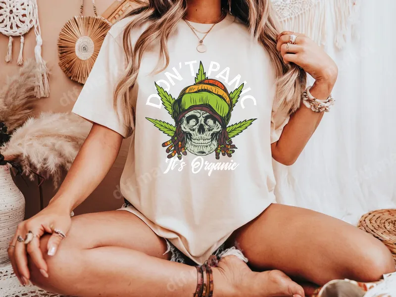 See allIntroduces the "Don't Panic It's Organic" Rasta skull DTF transfer. It showcases a vibrant skull adorned with a classic green, yellow, and red rasta beanie and flowing dreadlocks, flanked by iconic cannabis leaves. This high-quality direct to film transfer is ready to press, offering a unique blend of humor and laid-back style. Perfect for cannabis enthusiasts, reggae music lovers, or anyone who appreciates a chill, humorous vibe. This unique design makes an excellent gift for friends celebrating 420, attending music festivals, or simply enjoying casual everyday wear. It’s an ideal way to express a relaxed attitude with a touch of playful rebellion. Applying this heat press transfer is incredibly easy, making garment customization accessible to everyone. Our professional heat press ready design adheres seamlessly to a wide range of materials, including cotton, polyester, and various fabric blends. For best results, use a heat press at 300-325°F for 15 seconds with medium pressure, or apply with a household iron. No tedious weeding is required, just press and peel. This iron on decal ensures a smooth, durable finish. Crafted using premium DTF film and inks, this t-shirt transfer promises exceptional vibrancy and durability. The colors are rich and won't crack, peel, or fade, ensuring your customized apparel stands the test of time. Enjoy a soft-to-touch finish that blends seamlessly with the fabric, creating a truly professional look. Elevate your wardrobe with this standout apparel transfer.