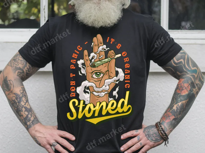 See allUnleash your chill with our 'Don't Panic - It's Organic, Stoned' DTF transfer, a vibrant and expressive design that speaks volumes. This eye-catching graphic features a stylized hand holding a lit cannabis joint, enveloped in wisps of smoke, with a striking all-seeing eye peering from the palm. The bold yellow 'Stoned' lettering and playful orange 'Don't Panic - It's Organic' text create a fun, irreverent vibe. This high-quality DTF transfer is ready to press, making it easy to add a unique statement to your apparel. Perfect for cannabis enthusiasts, festival-goers, or anyone with a laid-back sense of humor, this design makes a fantastic conversation starter. It's an ideal ready to press transfer for personalizing gifts for friends who appreciate 420 culture, celebrating holidays like April 20th, or simply expressing your own chill lifestyle. Stand out at concerts, casual gatherings, or just lounging at home with this distinctly cool iron on transfer. Applying this heat transfer is a breeze on almost any fabric type, including cotton, polyester, and their blends. For best results, use a heat press at 300-325°F for 15 seconds with medium, even pressure. A household iron can also be used with firm, consistent pressure. One of the greatest advantages of our heat press ready designs is that there's absolutely no weeding required, saving you time and effort for a perfect application every time. Experience exceptional durability and stunning visual appeal with this premium t-shirt transfer. Our DTF transfers boast incredibly vibrant colors that pop, superior crack resistance for long-lasting wear, and a soft-to-the-touch finish that feels great on any garment. Printed on professional-grade DTF film with a strong, reliable adhesive, this heat press design ensures your custom creations look fantastic wash after wash.
