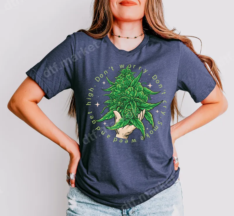 See allThis vibrant DTF transfer showcases a playful and relaxed attitude with its "Don't Worry. Don't Cry. Smoke Weed and Get High" slogan encircling an artfully rendered hand holding a lush cannabis bud. The design captures a chill, easy-going vibe, perfect for those who appreciate cannabis culture and humor. This ready to press transfer is designed for effortless application, bringing a unique statement to your wardrobe. Ideal for cannabis enthusiasts, festival-goers, or anyone with a laid-back sense of humor, this heat press design makes a fantastic statement piece. It's perfect for casual wear, weekend events, or as a thoughtful and funny gift for friends who appreciate the green leaf. Great for 4/20 celebrations, birthdays, or just adding a touch of chill to everyday apparel. Our high-quality heat transfer is compatible with a wide range of materials, including 100% cotton, 100% polyester, and cotton/poly blends. Application is straightforward: simply use a heat press at 300-325°F for 15 seconds with medium pressure. No complex weeding or layering needed, just press and peel! For household irons, ensure even, firm pressure. Experience professional-grade results with our durable and vibrant DTF transfers. These iron on decals offer excellent wash fastness, are crack-resistant, and remain soft to the touch, ensuring long-lasting wear. Crafted with premium DTF film and a strong adhesive, your apparel will look professionally customized and maintain its rich colors for many washes.