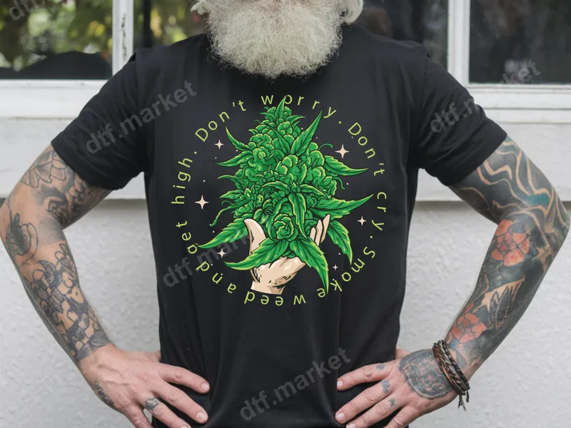 See allThis vibrant DTF transfer features a detailed cannabis bud held by a hand, surrounded by the humorous phrase 'Don't worry. Don't cry. Smoke weed and get high.' This eye-catching design is a statement piece, ready to press onto your favorite apparel and showcase your relaxed attitude with a touch of stoner humor. It's the perfect direct to film transfer for those who appreciate a laid-back lifestyle. Ideal for cannabis enthusiasts, recreational users, and anyone who appreciates adult humor, this heat press ready design is perfect for casual wear, parties, festivals, or as a unique gift. Celebrate 4/20, birthdays, or just everyday chill vibes with a custom shirt or accessory that stands out from the crowd. Our premium heat transfer ensures a smooth application on a wide range of fabrics including cotton, polyester, and blends. Easily apply this iron on transfer with a heat press at 300-325°F for 15 seconds with medium pressure, or even a household iron for smaller designs. No weeding or layering required, making customization quick and simple. Experience superior quality with this durable t-shirt transfer. The vibrant colors are crack-resistant and soft to the touch, ensuring your design looks professional and lasts wash after wash. Transform ordinary garments into personalized statements with this high-quality apparel transfer, designed for lasting appeal and easy application.