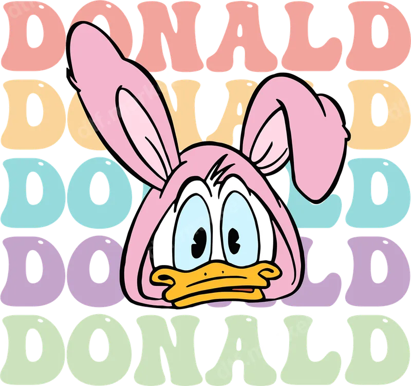 See allCelebrate the season with this charming 'Donald' DTF transfer, featuring the beloved animated duck character playfully dressed in pink bunny ears. The design incorporates a groovy, retro-inspired font in soft pastel shades, repeating 'DONALD' in the background, creating a fun and nostalgic aesthetic. This high-quality direct to film transfer is ready to press, perfect for creating custom apparel and accessories. This playful heat press transfer is ideal for anyone who loves classic cartoons, retro styles, or unique holiday fashion. It’s perfect for custom Easter outfits, family matching shirts, or themed party wear. Surprise a fan with a personalized gift for birthdays, spring events, or as a thoughtful gesture. Whether making a statement or just adding vintage charm, this design is sure to bring smiles and compliments. Our premium iron on decal applies effortlessly to cotton, polyester, cotton/poly blends, and tri-blend fabrics. For best results, use a heat press at 300-325°F for 15 seconds with medium pressure, followed by a cold peel. A household iron can also be used. Forget the hassle of vinyl weeding; this ready to press transfer ensures a clean, professional finish every time. Experience superior quality with our professionally printed DTF transfers. Each design boasts vibrant, true-to-color hues that stand out, with excellent durability, resisting cracking and peeling even after multiple washes. The print feels soft to the touch, seamlessly integrating with the fabric for maximum comfort. Made with robust DTF film and strong adhesive, these apparel transfers are built to last, ensuring your custom creations look fantastic.