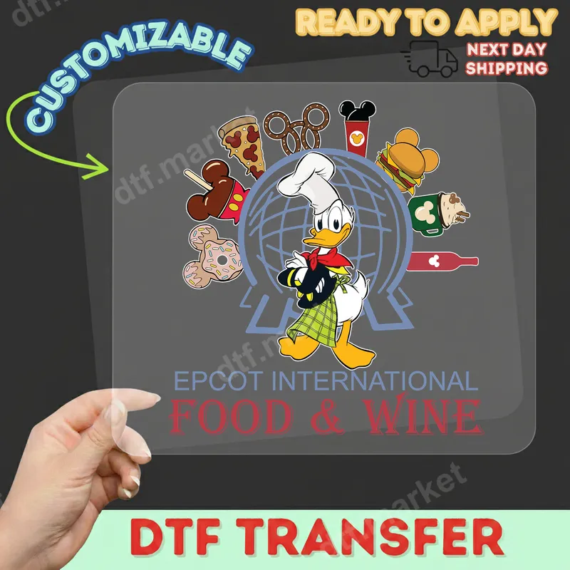 See allThis delightful DTF transfer features Donald Duck as a cheerful chef, standing proudly in front of Epcot's iconic Spaceship Earth. Surrounded by an array of delectable, Mickey-shaped treats and beverages like pizza, pretzels, donuts, burgers, and wine, this design perfectly captures the spirit of the Epcot International Food & Wine Festival. It's a vibrant, ready to press graphic that brings the magic of the festival right to your apparel. Ideal for Disney enthusiasts, food lovers, and world travelers, this heat press transfer is perfect for creating custom gear for your next Epcot visit, family vacation, or just to show off your foodie passion. It makes a fantastic gift for friends and family planning a trip or reminiscing about past culinary adventures at the parks. Stand out with unique custom clothing that celebrates one of Disney's most beloved annual events. Applying this design is simple and efficient. This iron on transfer works seamlessly on a wide variety of fabrics, including cotton, polyester, and their blends. For best results, use a heat press at 300-325°F for 15 seconds with medium pressure. It's also possible to apply with a household iron, following included instructions. No complicated weeding or layering is required, making your crafting process quick and enjoyable. Crafted using professional-grade DTF film and inks, this t-shirt transfer boasts exceptional vibrancy and durability. The colors are vivid and long-lasting, resisting cracks and peels even after multiple washes. Enjoy a soft, smooth feel on your garment, ensuring comfort alongside a professional finish. Transform your apparel into a personal statement with this high-quality, long-lasting design.