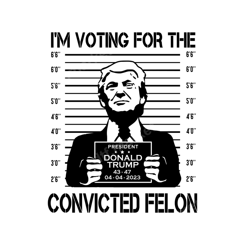See allThis striking black and white DTF transfer features a stylized mugshot of Donald Trump, complete with a height chart background and the distinct wording "I'M VOTING FOR THE CONVICTED FELON." Below the Trump image, a sign reads "PRESIDENT DONALD TRUMP 43 • 47 04-04-2023." This ready to press design is a powerful and direct political statement, designed for those who want to express their specific viewpoint on current events and political figures. It captures a controversial moment with stark, impactful imagery. Perfect for political rallies, protest events, or simply everyday wear to spark conversation, this heat transfer is ideal for individuals who are outspoken about their anti-Trump sentiments. It's a great choice for political activists, commentators, or anyone looking to make a strong visual statement during election seasons or public demonstrations. Gift this unique iron on transfer to friends or family who share similar political views and enjoy bold, contemporary political humor. Applying this heat press design is straightforward. Our high-quality DTF transfers adhere beautifully to a wide range of fabrics including cotton, polyester, and cotton/poly blends. For best results, use a heat press at 280-300°F (138-149°C) for 6-10 seconds with medium pressure, then perform an instant, hot peel. You can also use a household iron, ensuring even, firm pressure. Enjoy the convenience of a ready to press transfer with no tedious weeding required. Our apparel transfers are crafted using premium DTF film and inks, ensuring vibrant, long-lasting colors and exceptional durability. The resulting print is crack-resistant, washable, and boasts a remarkably soft feel on the fabric, unlike traditional vinyl transfer options. With professional-grade strong adhesive, your design will stay securely in place, maintaining its sharp details and powerful message through countless wears and washes.