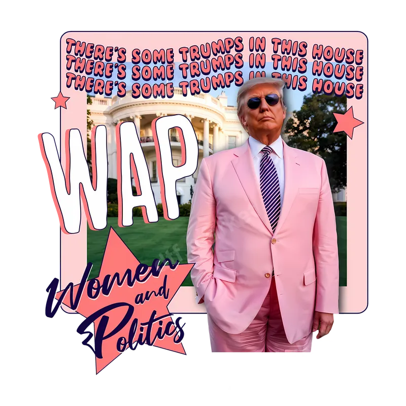 See allThis eye-catching DTF transfer features a humorous, meme-inspired depiction of Donald Trump in a vibrant pink suit, set against the iconic White House. The design boldly displays "WAP" and "THERE'S SOME TRUMPS IN THIS HOUSE," alongside "Women and Politics," creating satirical commentary on current events. This ready to press heat press design is perfect for making a statement. Ideal for political rallies, protest events, or everyday wear to spark conversation, this iron on transfer appeals to individuals with a sharp sense of humor and an interest in political satire. It's a unique gift idea for friends who follow current events, appreciate pop culture memes, or enjoy expressing their views through witty fashion. Perfect for adding a provocative touch to any wardrobe. Applying this direct to film transfer is straightforward and hassle-free, working perfectly on cotton, polyester, and various fabric blends. For best results, use a heat press at 280-300°F (138-149°C) with medium pressure for 6-10 seconds, followed by an instant peel. You can also achieve great results with a household iron, making it accessible for everyone. No weeding or complicated setup is required, saving you time. Crafted using premium DTF film and professional-grade inks, this apparel transfer promises exceptional durability and a vibrant, crack-resistant finish. The soft-to-touch feel ensures maximum comfort, while the strong adhesive guarantees a long-lasting print that withstands numerous washes. Get a high-quality, ready to press transfer that looks fantastic and makes a statement.