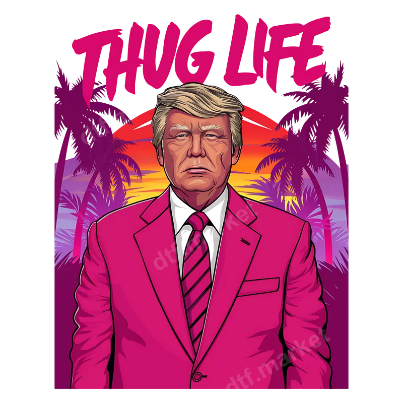 See allThis eye-catching DTF transfer features a stylized illustration of Donald Trump in a vibrant pink suit and tie, set against a retro Miami Vice-inspired sunset with silhouetted palm trees. Bold "THUG LIFE" lettering in a neon pink font crowns the design, creating a unique blend of political commentary and pop culture aesthetics. This ready to press design offers a humorous and edgy statement piece for those looking to express their views with a distinctive flair. Ideal for political enthusiasts, meme lovers, and anyone with a sarcastic sense of humor, this design makes a great conversation starter. It's perfect for casual wear, political rallies (or counter-rallies), novelty gifts, or just adding a touch of ironic flair to your wardrobe. Whether you're a supporter or a critic, this design offers a playful take on a controversial figure, suitable for friends who appreciate political satire. Our high-quality heat transfer is incredibly versatile and can be applied to almost any fabric type, including cotton, polyester, and their blends. For best results, use a heat press at 280-300°F for 6-10 seconds with medium pressure, then peel instantly. This iron on transfer also works well with a household iron (firm, even pressure) if a heat press isn't available. Enjoy the convenience of a ready to press transfer with absolutely no weeding required, making customization quick and easy. Experience superior quality with our direct to film transfer. Each design is printed with vibrant, long-lasting inks that resist cracking and fading, ensuring your apparel transfer looks great wash after wash. The professional-grade DTF film provides a soft, flexible feel on your garment, not a thick, heavy texture. With strong adhesive properties, this shirt design will securely bond to your chosen fabric, delivering a durable and professional finish every time.
